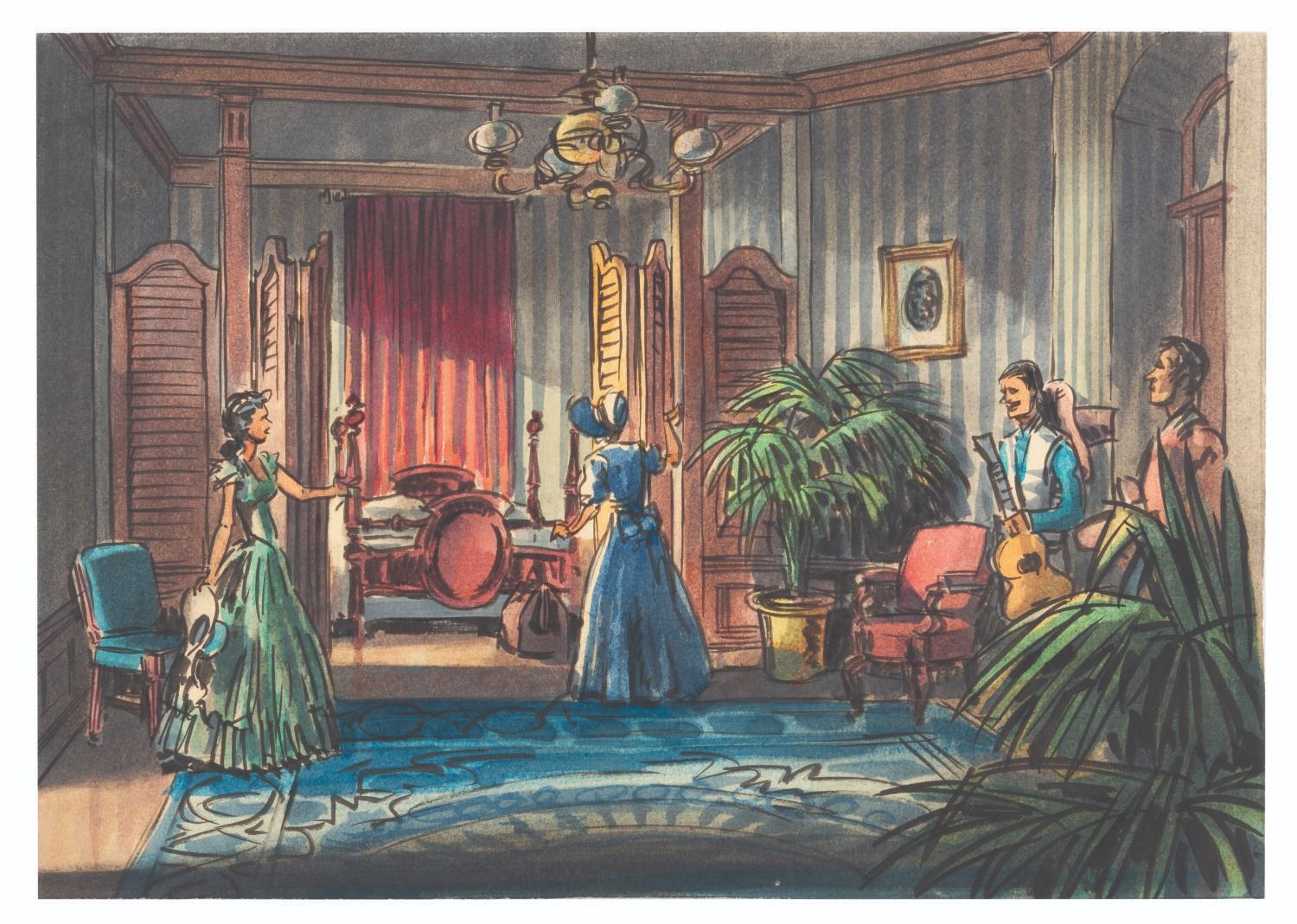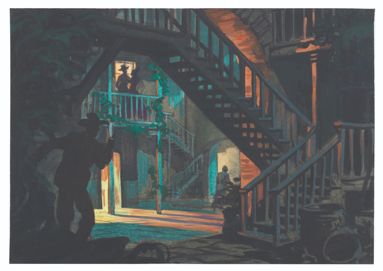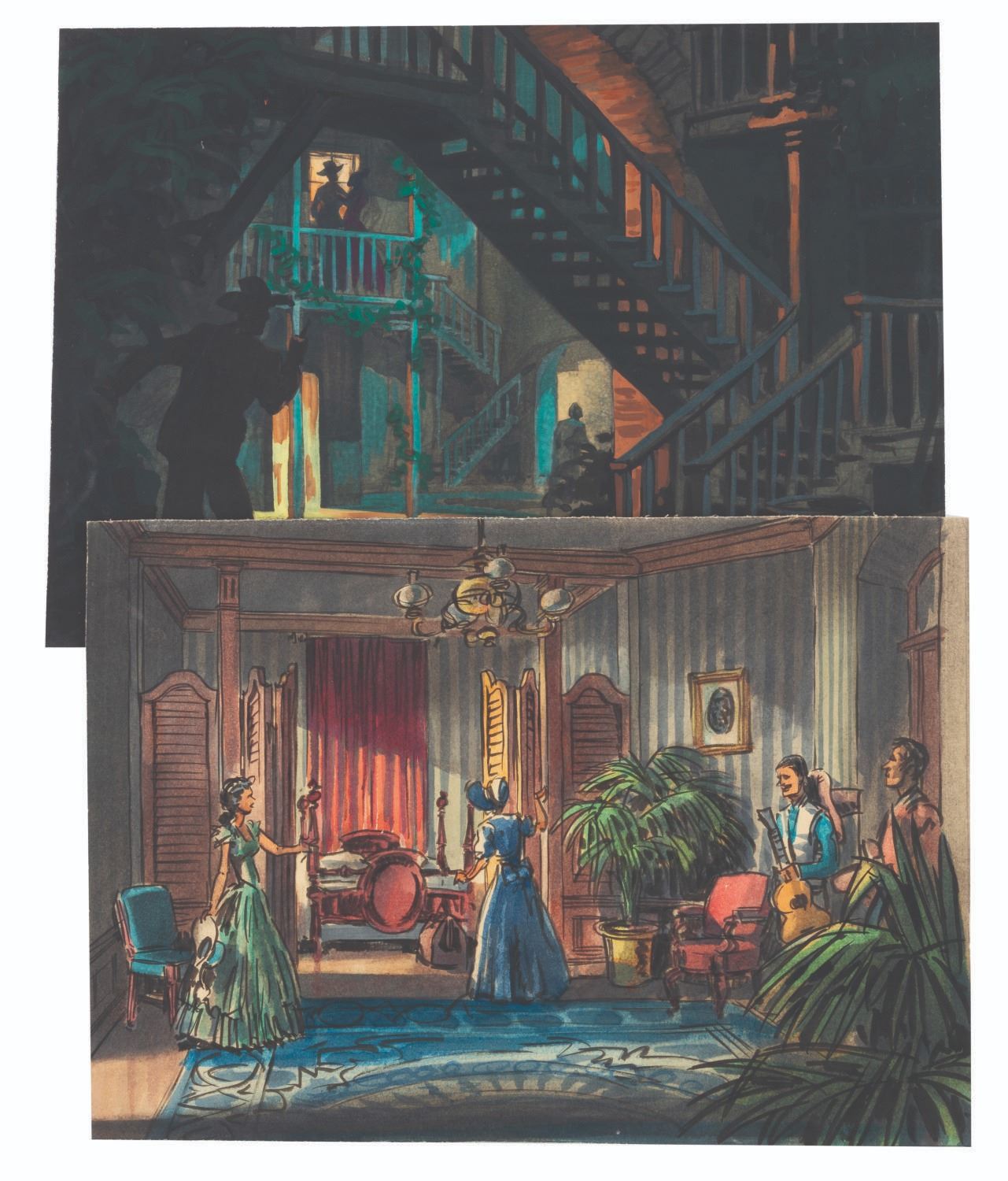 (Goff, 1945) A beautiful pair of concept paintings by Disney Legend Harper Goff for the Errol Flynn Western "San Antonio." Despite his important contributions to many film and television productions, Goff was not always credited for his work. Ranging in size from 8.25" x 11.5" to 8.25" x 11.75", the paintings are in very good condition with light spots of paint loss and wear from production use.