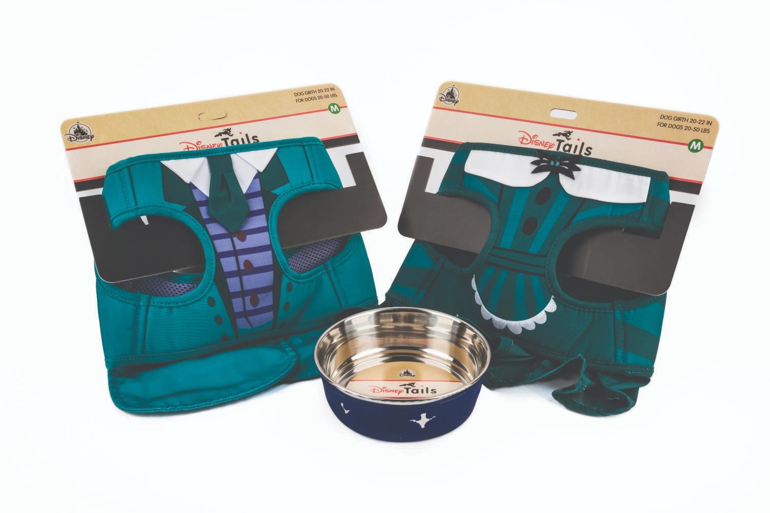 (Disney) A pair of Haunted Mansion Harnesses and a bowl. The harnesses are compatible with a dog girth of 20-22 inches and dogs weighing 20-50 lbs. The 5.5" diameter and 2" tall pet bowl holds 2 cups. Each piece is in fine condition.