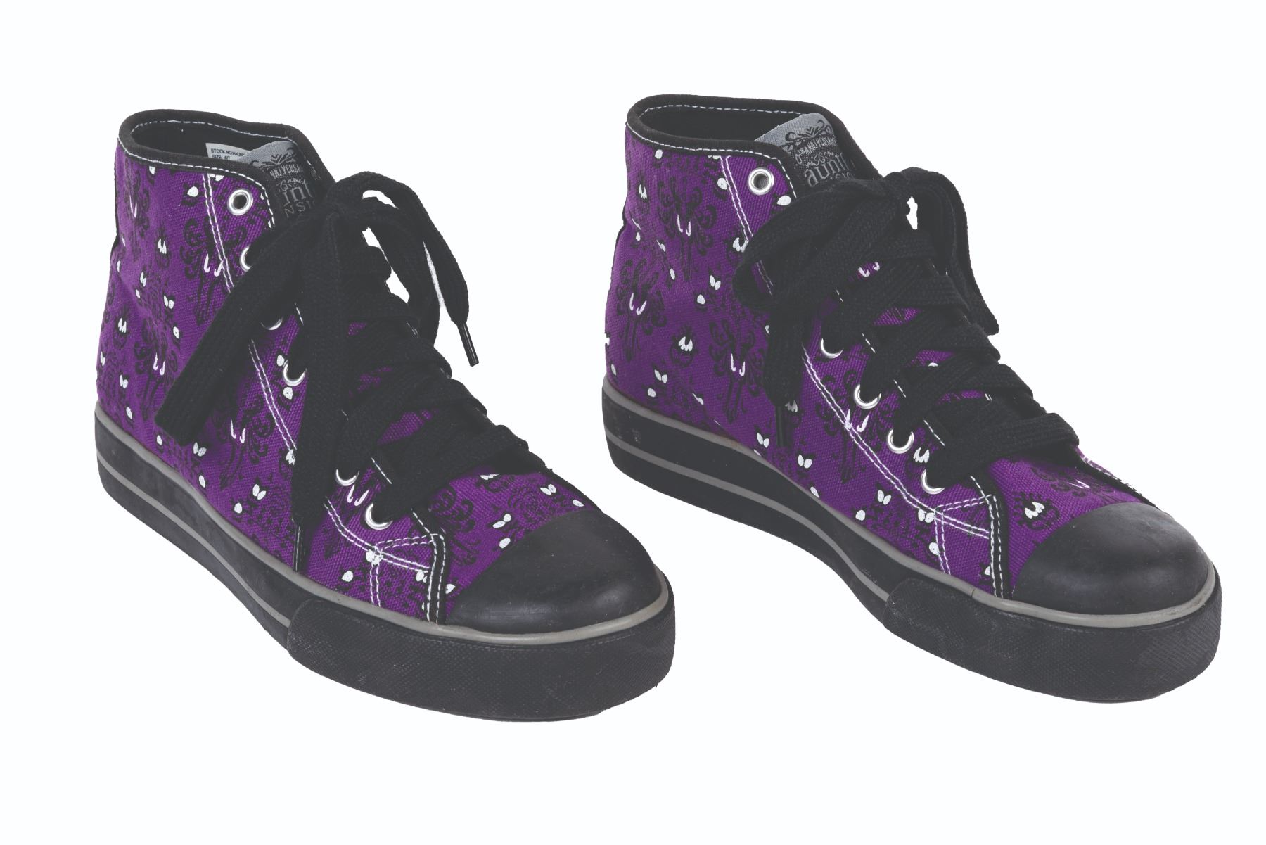 (Disneyland, 2009) A pair of Haunted Mansion shoes released for the 40th anniversary of the Haunted Mansion at Disneyland. The shoes feature a Haunted Mansion wallpaper motif and were manufactured by New Balance. Measuring a Women's size 7, the shoes exhibit some wear from use but are in very good condition.