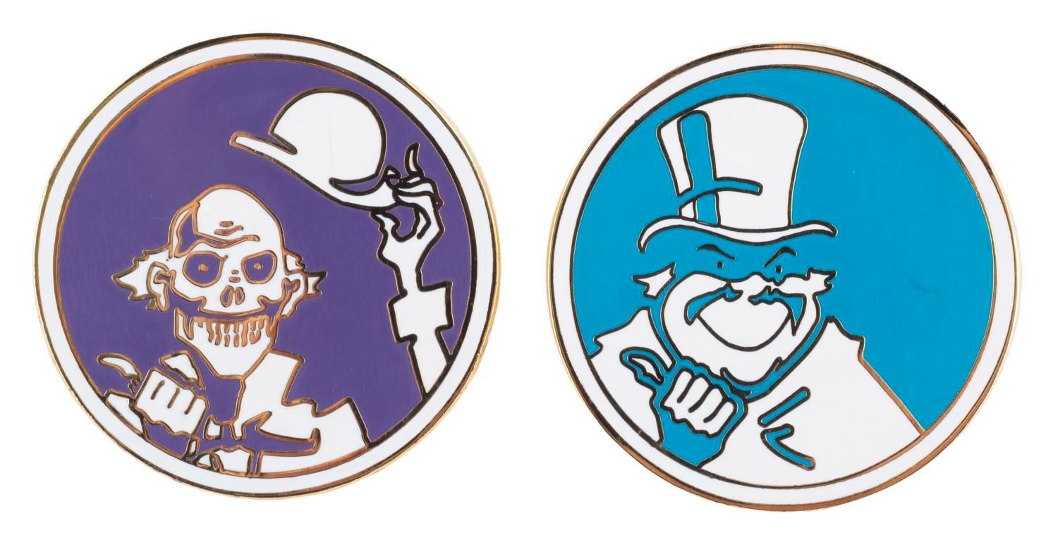 (Walt Disney World, 2002) A pair of Hitchhiking Ghost pins released exclusively at Walt Disney World in 2002. Measuring 1” in diameter each, the pins are in very good condition.
