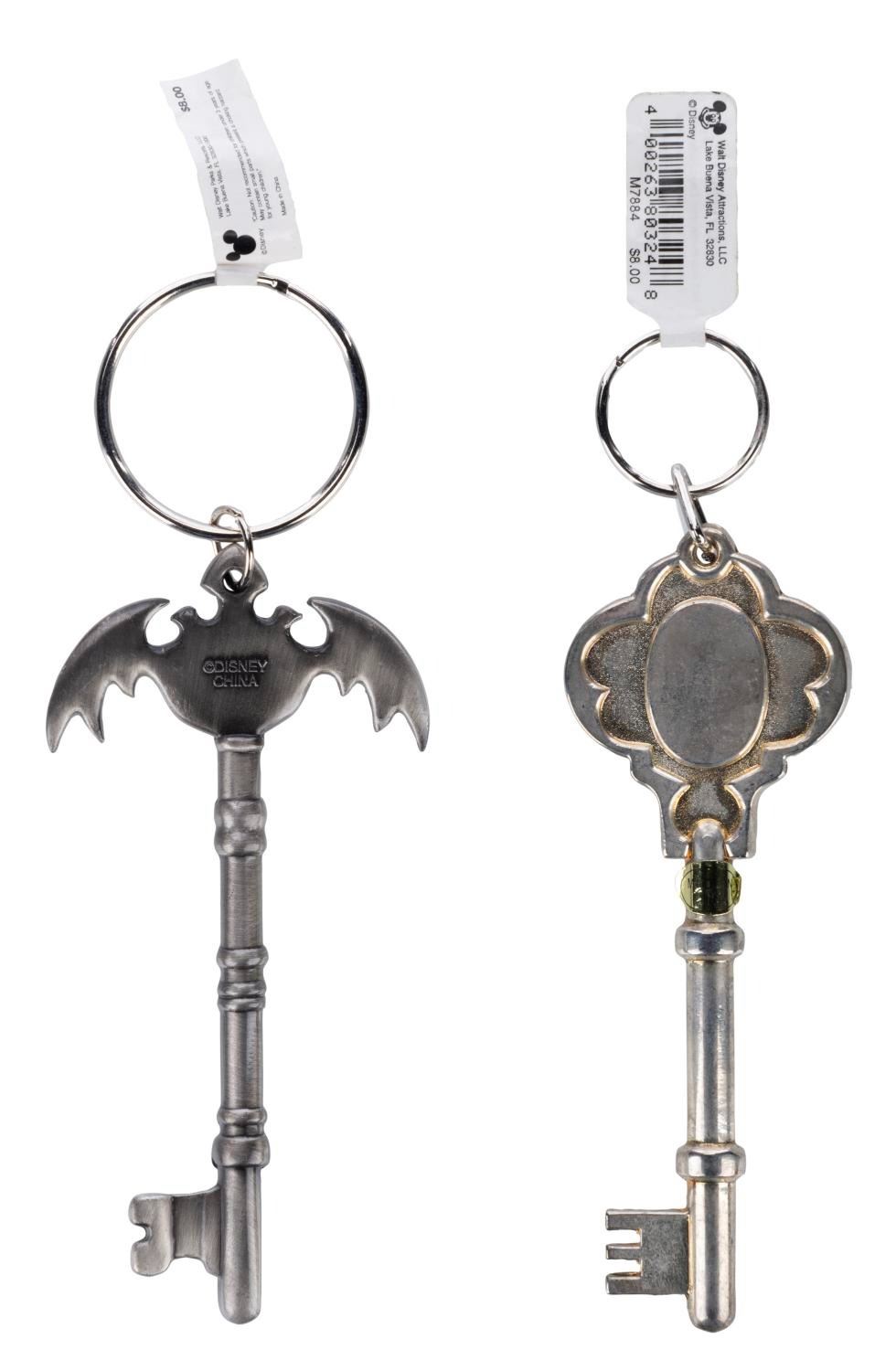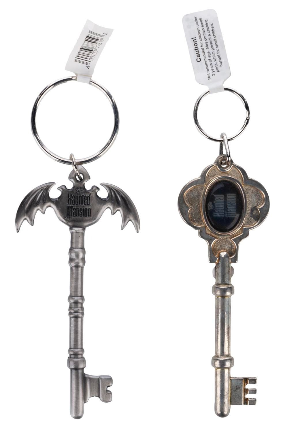 (Walt Disney World, 2000s) A pair of key-shaped Haunted Mansion keyrings from Walt Disney World. Measuring 4.5" long, each piece is in very good condition exhibiting minor wear.
