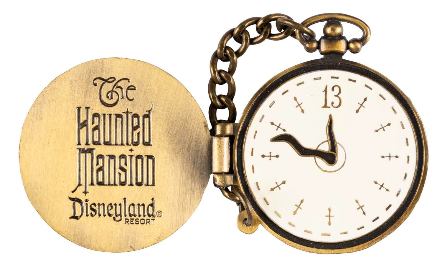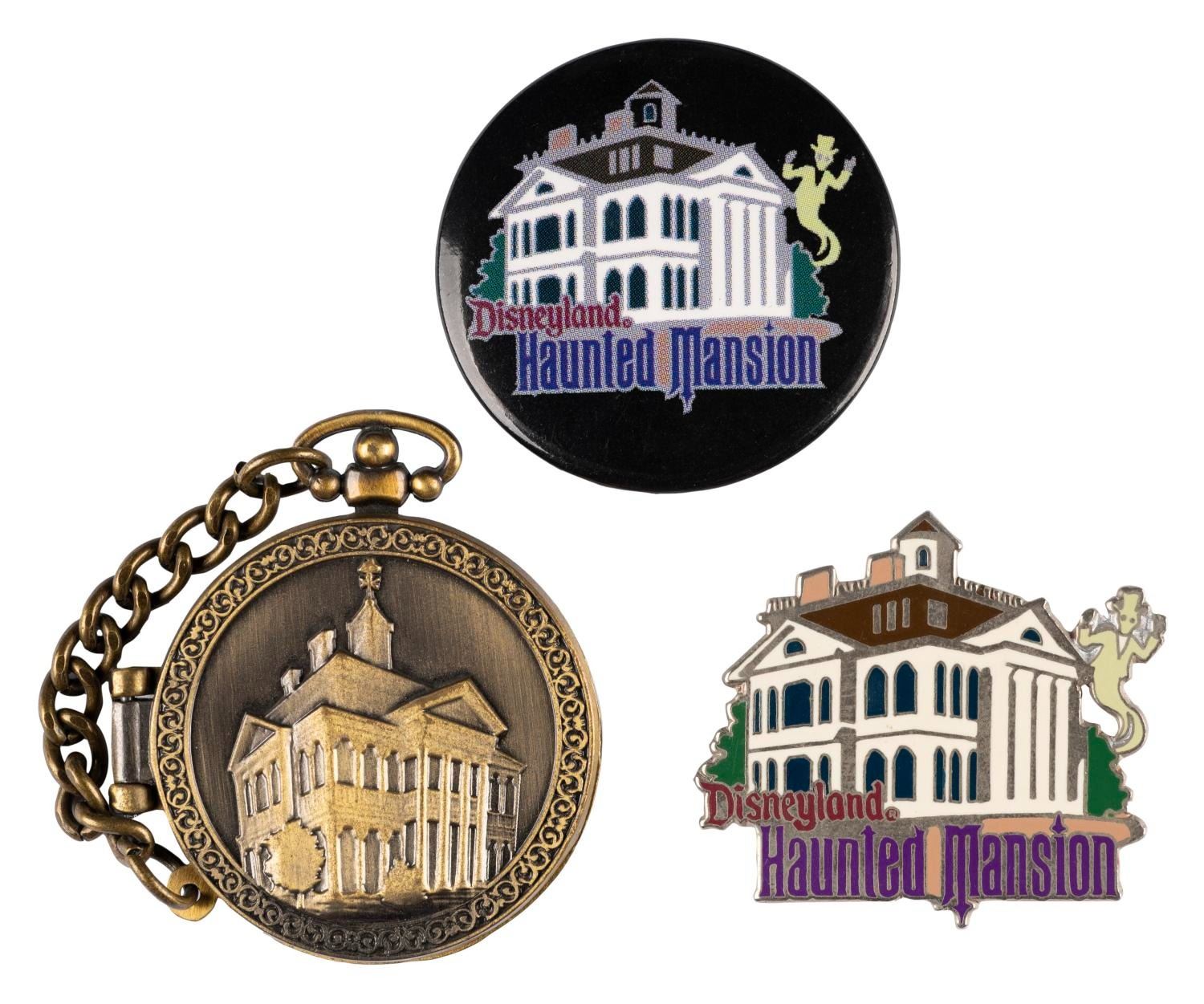 (Disneyland, 1998-2009) A collection of two Haunted Mansion pins and one button. The set includes an early Haunted Mansion pin from 1998 and a pinback button that matches its design, and an O-Pin House brass pocket watch pin from 2009. The pins and button are in very good condition.