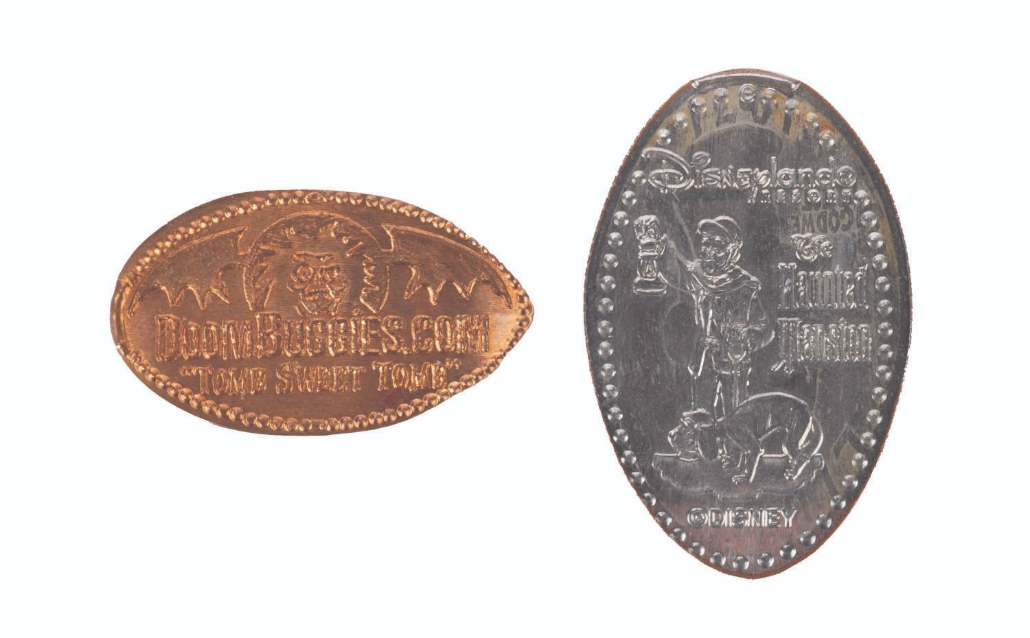 (Disneyland) A pair of Haunted Mansion pressed coins including "Tomb Sweet Tomb; DoomBuggies.com" and a Groundskeeper coin. Each piece is in fine condition.