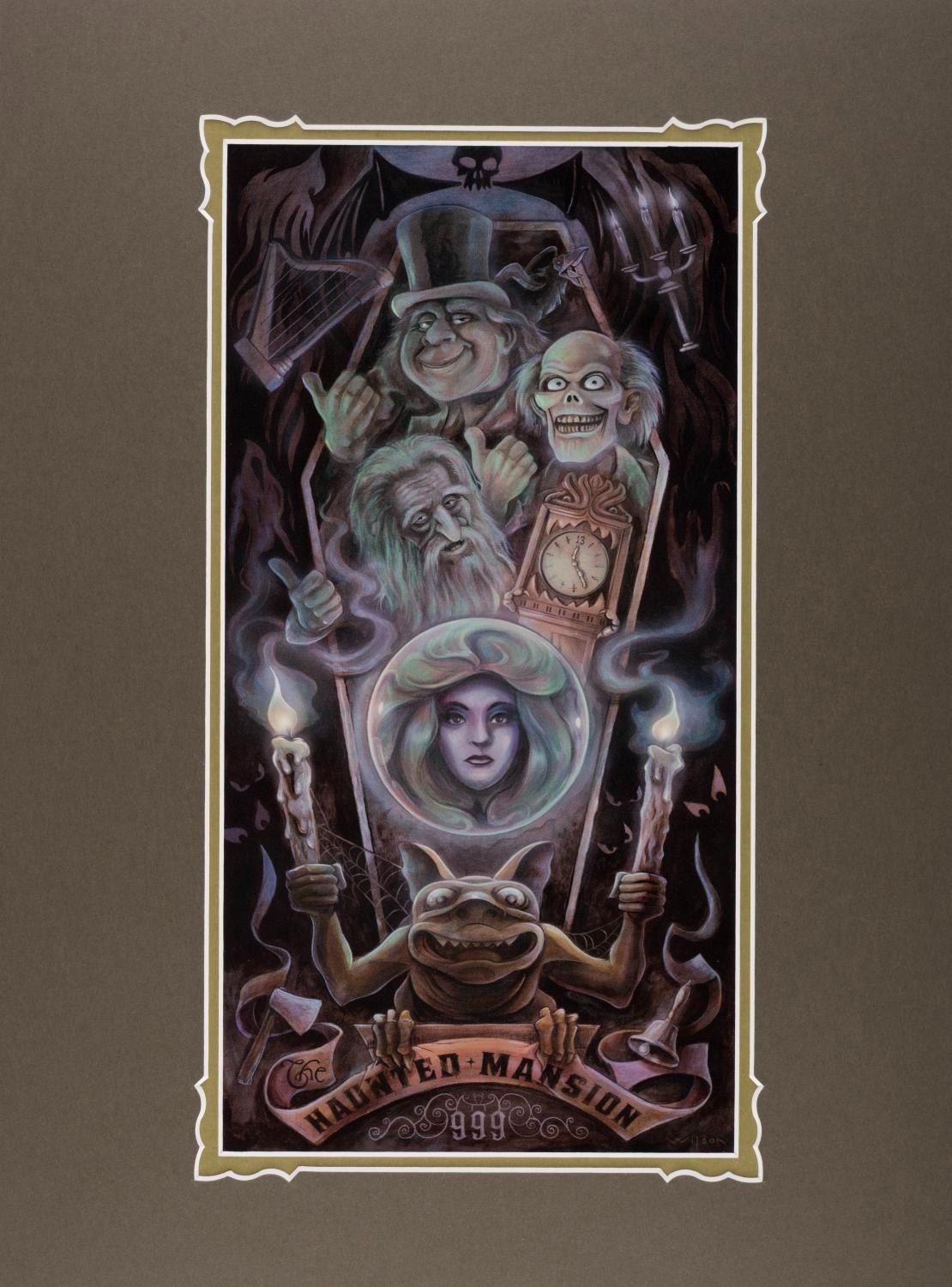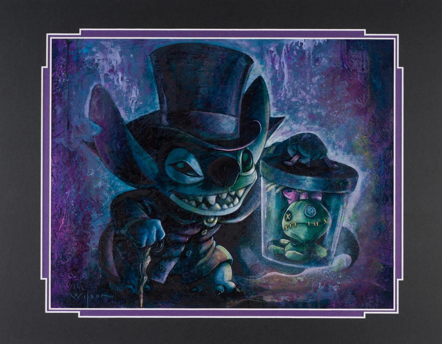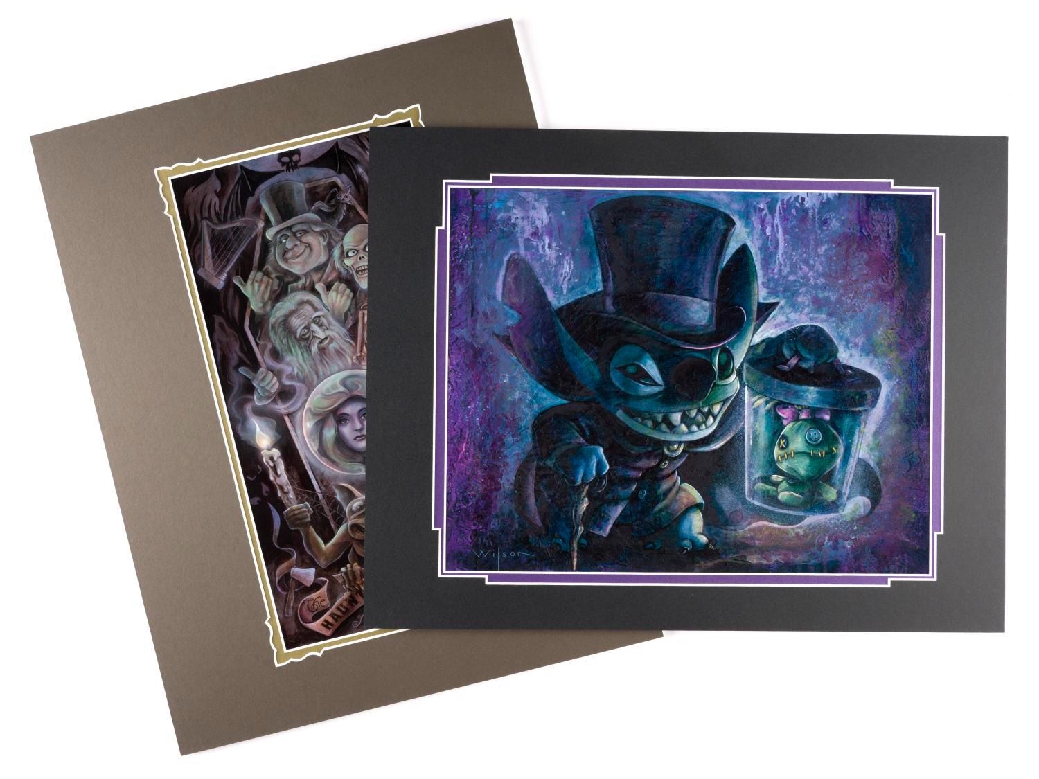 (The Art of Disney Theme Parks, 2019) A pair of Haunted Mansion Prints by Darren Wilson titled "Ghoulish Delight" and "Hatbox Haunted Stitch," released for the 50th anniversary of the attraction. Each piece comes with its 14" x 18" matte and is in fine condition.