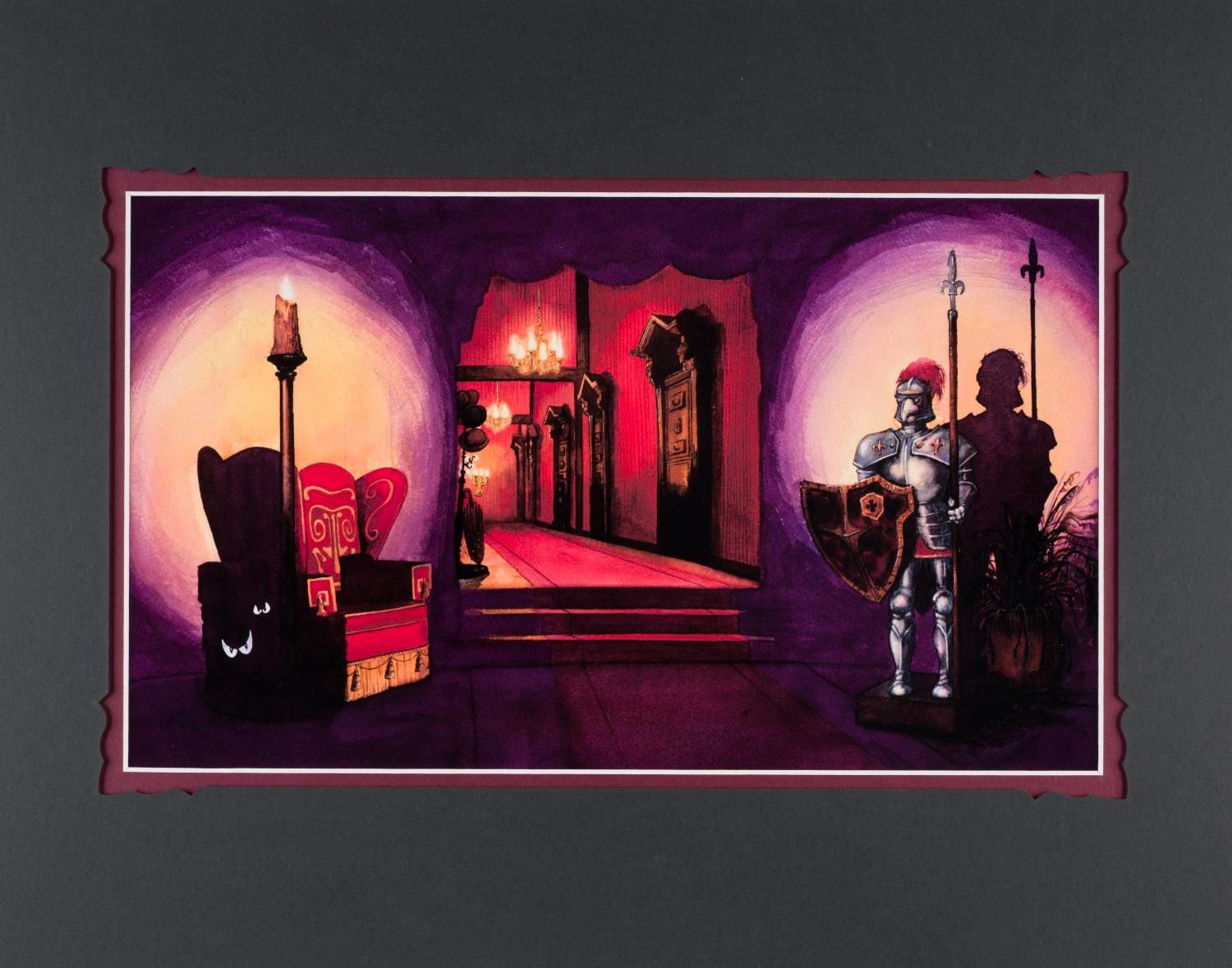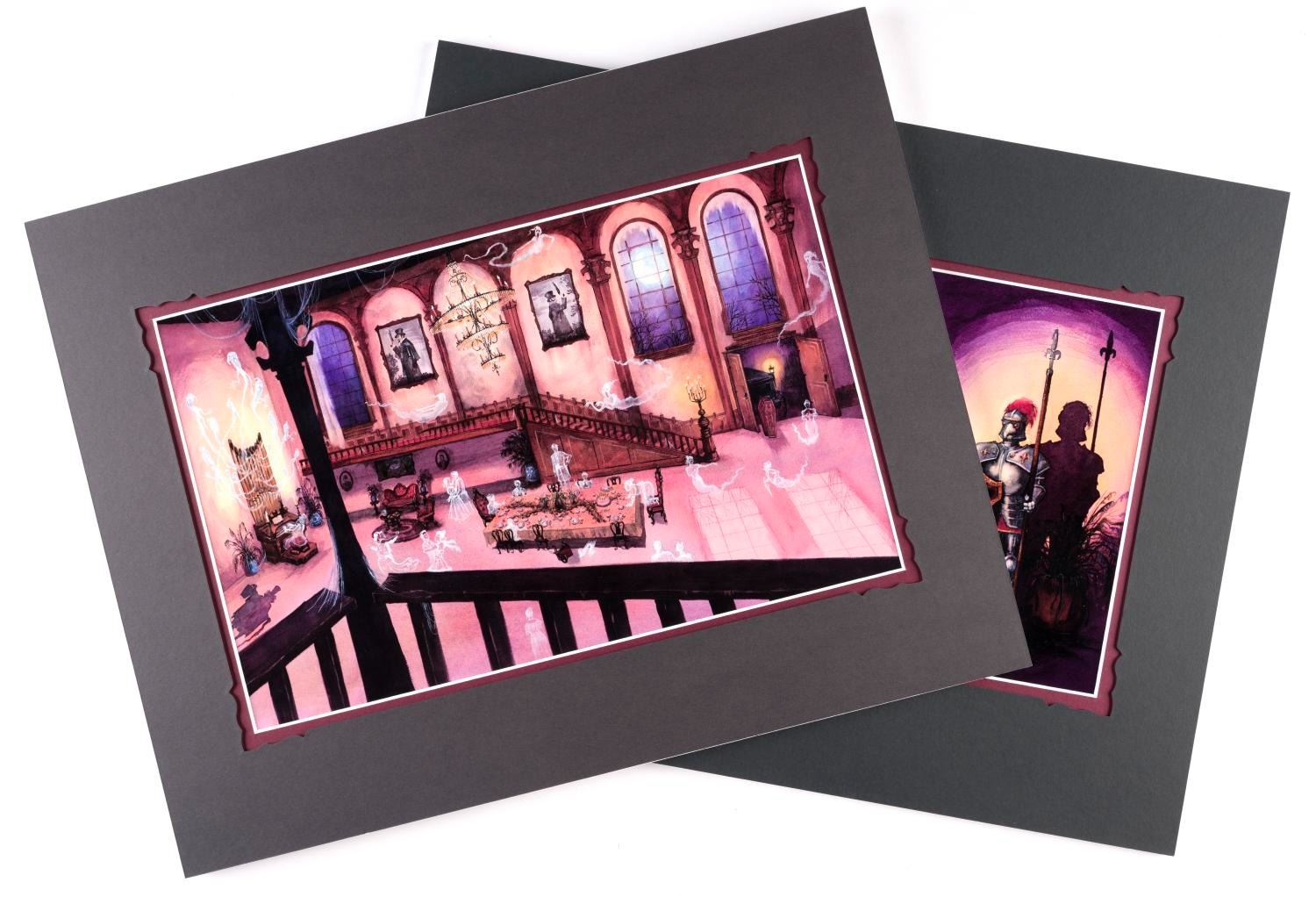 (The Art of Disney Theme Parks, 2019) A pair of Haunted Mansion Prints by Kevin-John titled "Swinging Wake" and "Running Chills," each released for the 50th anniversary of the attraction. Each piece comes within its 18" x 14" matte and is in fine condition.