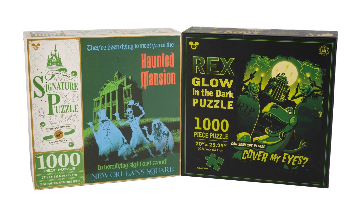 (Disney Parks, 1990s-2000s) A Haunted Mansion 45th Anniversary Signature Puzzle and a Toy Story Rex Glow-In-The-dark Puzzle. Each puzzle is in fine condition and comes packaged in the original 8” x 8” box.