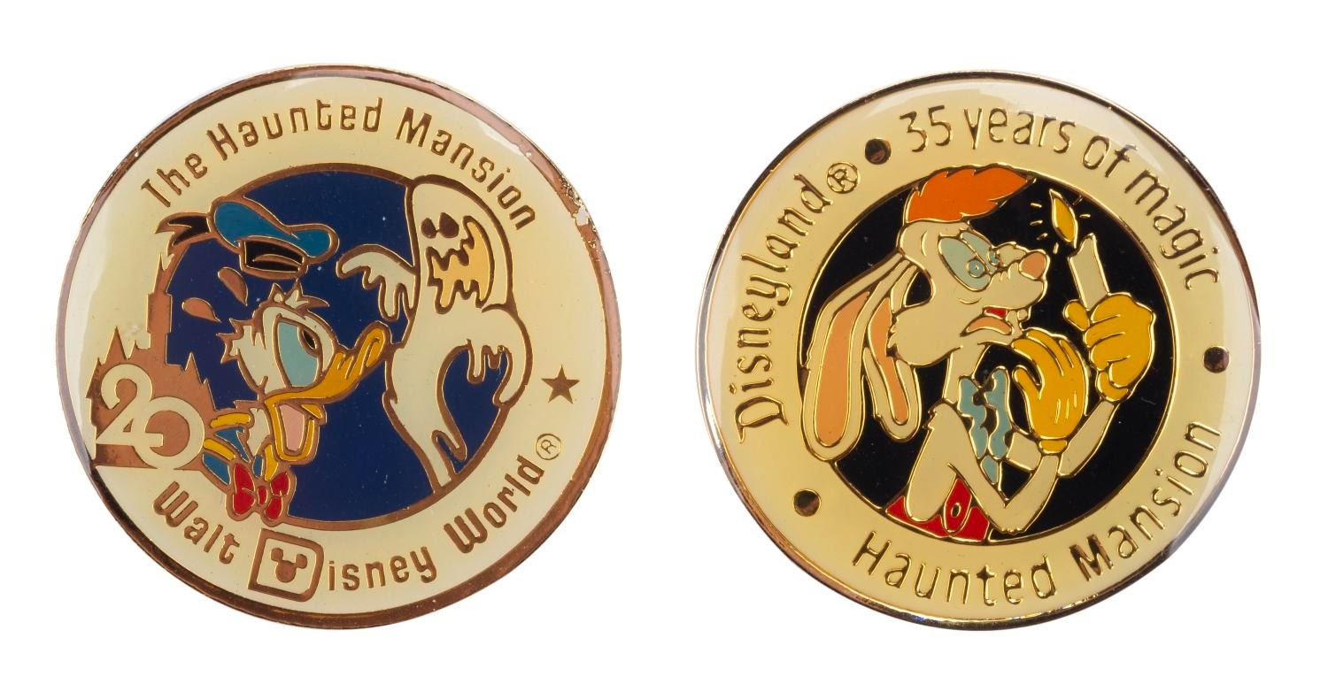 (Disneyland/Walt Disney World, 1990-91) A Pair of “Haunted Mansion 20” & “35 Years of Magic” Pins. Among this lot are pins honoring the “Disneyland: 35 Years of Magic” and “Walt Disney World: 20 Years of Magic” celebrations, each spotlighting The Haunted Mansion with popular characters Roger Rabbit and Donald Duck. Each pin is in fine condition with minor fading and yellowing to cloisonne.