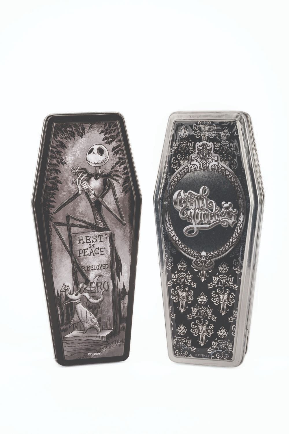 (Disney Parks, 2012-17) A pair of Disney Parks Haunted Mansion and Jack Skellington candy tins. The Gummi Worm candies have passed their expiration date, are intended for collectible purposes only, and should not be consumed. Measuring 3.5"x8", the tins are in fine condition.
