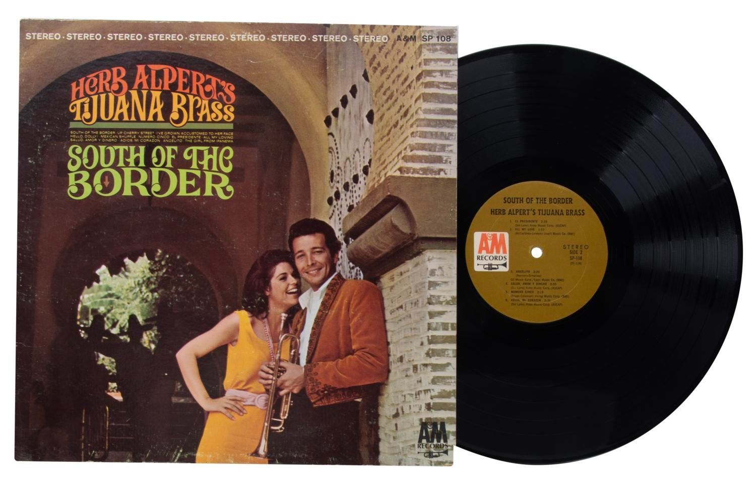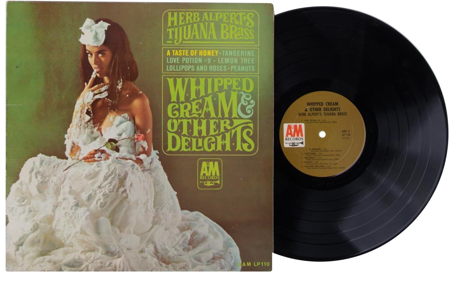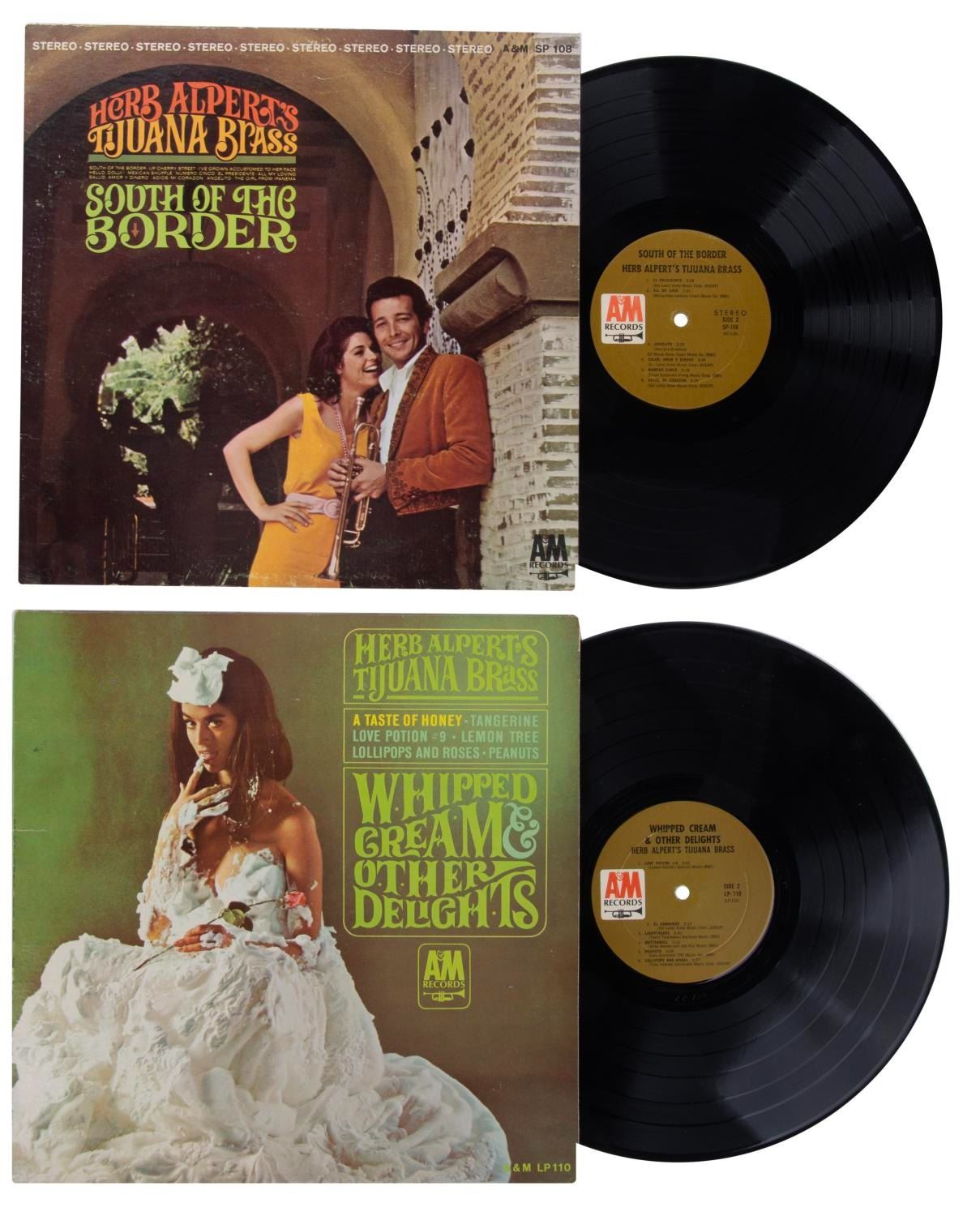 (A&M Records, 1964-65) A pair of albums by Herb Alpert's Tijuana Brass: South of the Border and Whipped Cream & Other Delights. Whipped Cream was the number one album of 1966, outselling The Beatles, Frank Sinatra, and The Rolling Stones. The 12" diameter records and 12.25" x 12.25" sleeves are in very good condition with edge wear and scuffing to the South of the Border sleeve.