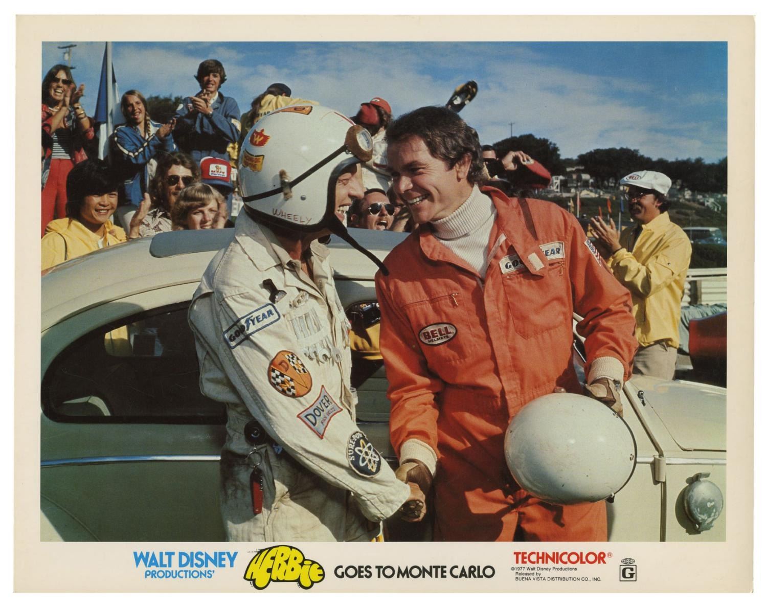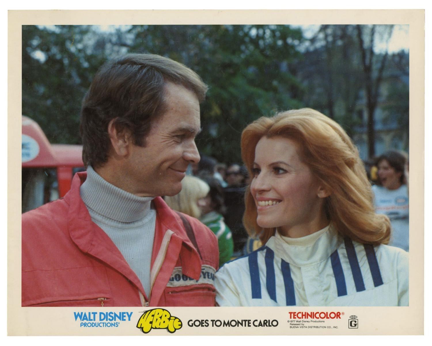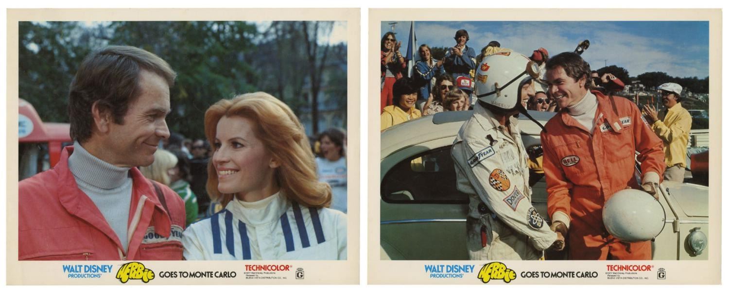 (Disney, 1977) A pair of original lobby cards for Walt Disney's “Herbie Goes to Monte Carlo.” This third installment of the Herbie series starred Dean Jones, Don Knotts, and Julie Sommars, all of whom can be seen on these two lobby cards. Measuring 11" x 14", the lobby cards are in good condition with light wear from use.