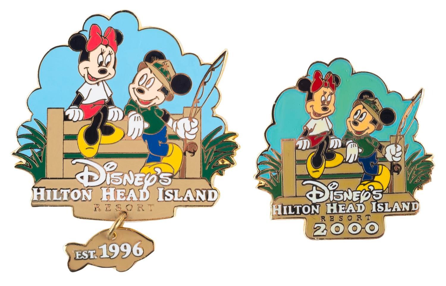 (Walt Disney World, 2000-2001) A pair of Disney’s Hilton Head Island Resort pins. The 2001 pin has a dangler "est. 1996” feature. The pins are in very good condition.