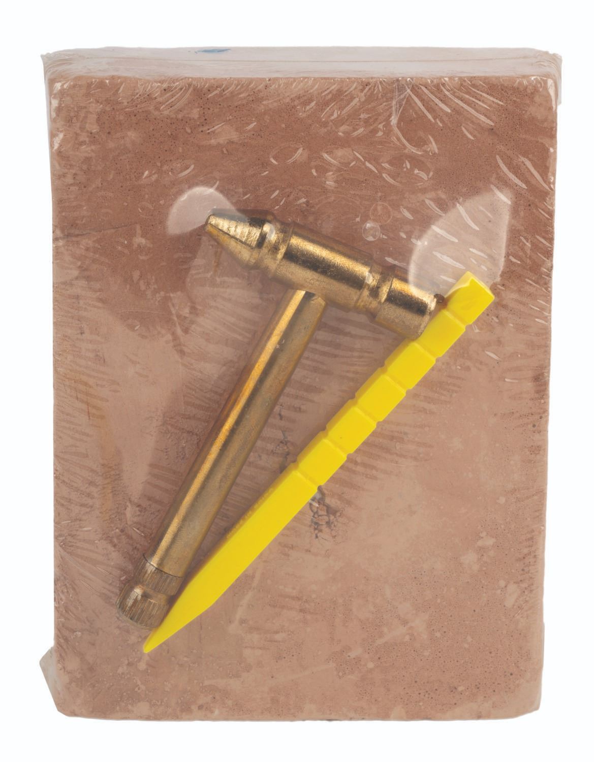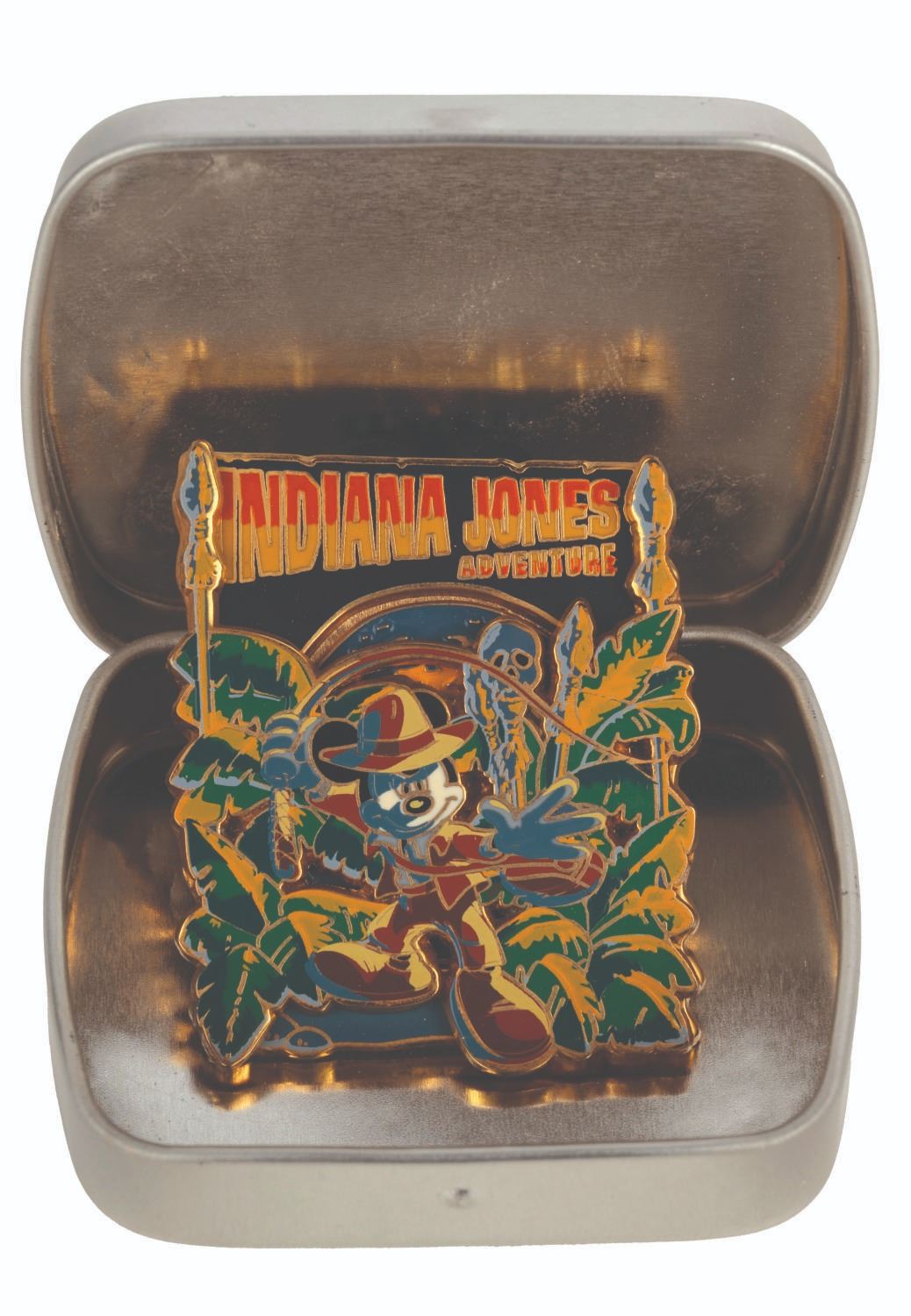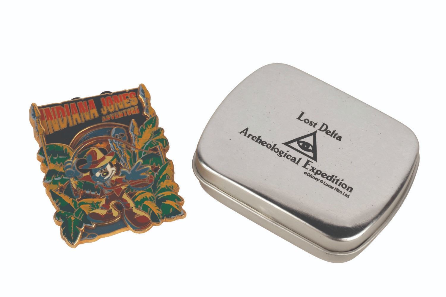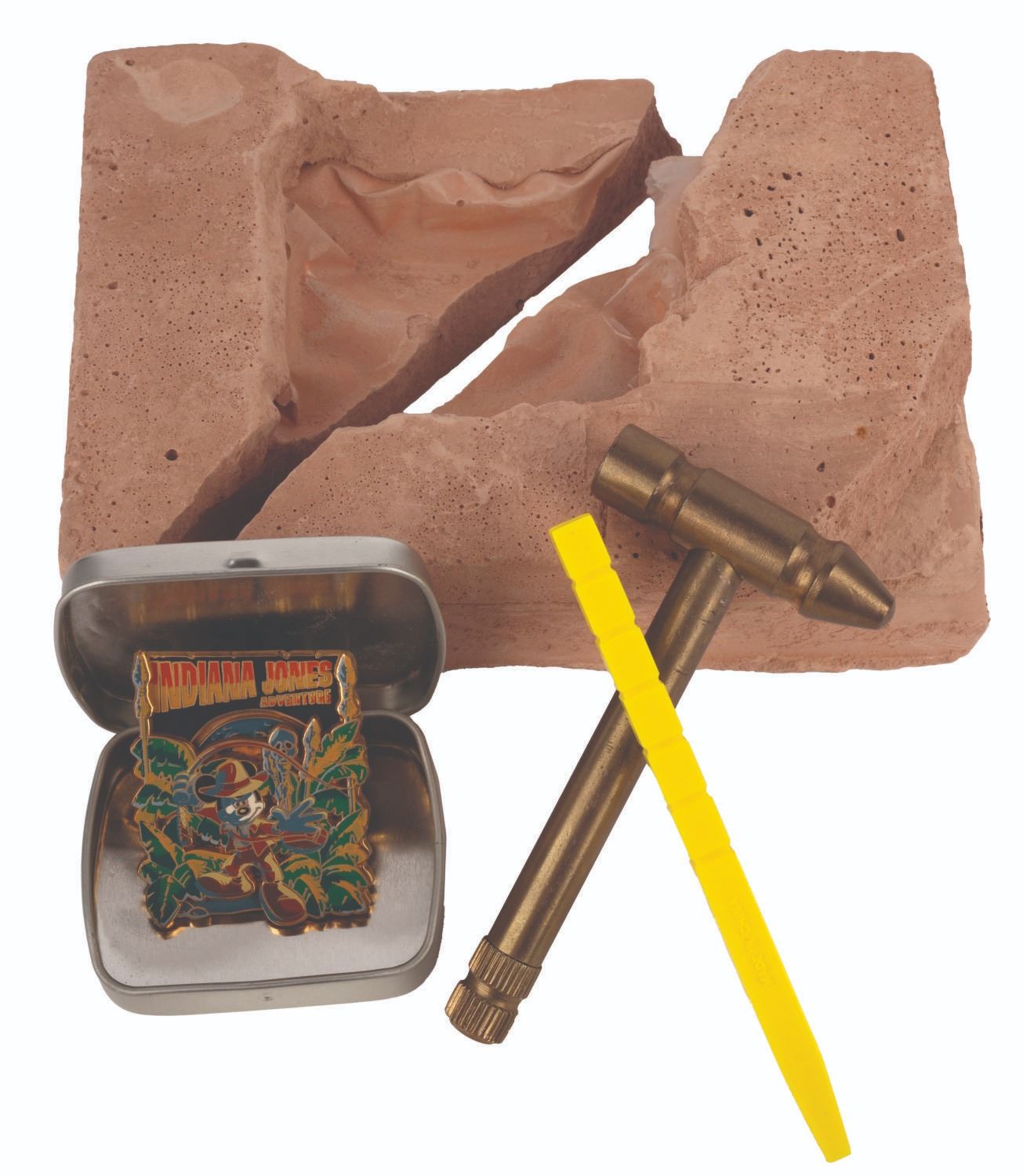 (Disneyland, 2005) A pair of gift souvenirs from the Indiana Jones Adventure 10th Anniversary Event at Disneyland. Guests were given a hammer and pick with a “stone” block that, when chipped away at, revealed a small tin case with souvenir pin from the attraction. One of the stone and tool sets has been opened, and the other is still sealed in shrink wrap. The sealed set measuring 5.75” x 4.75” x 2” is in fine condition, with the open set very good condition with obvious wear from use, including slight scuffing to the tin from disinterment.