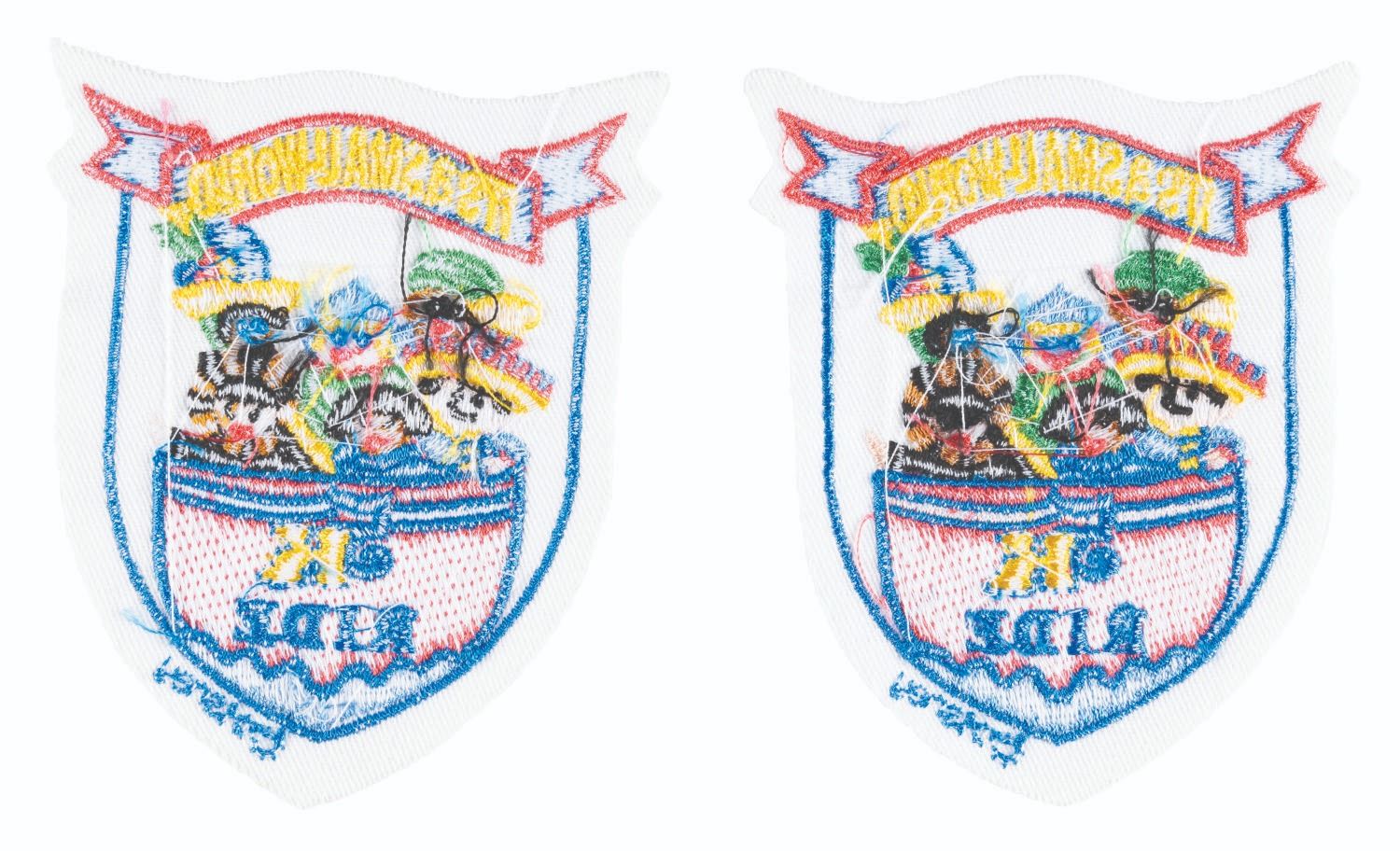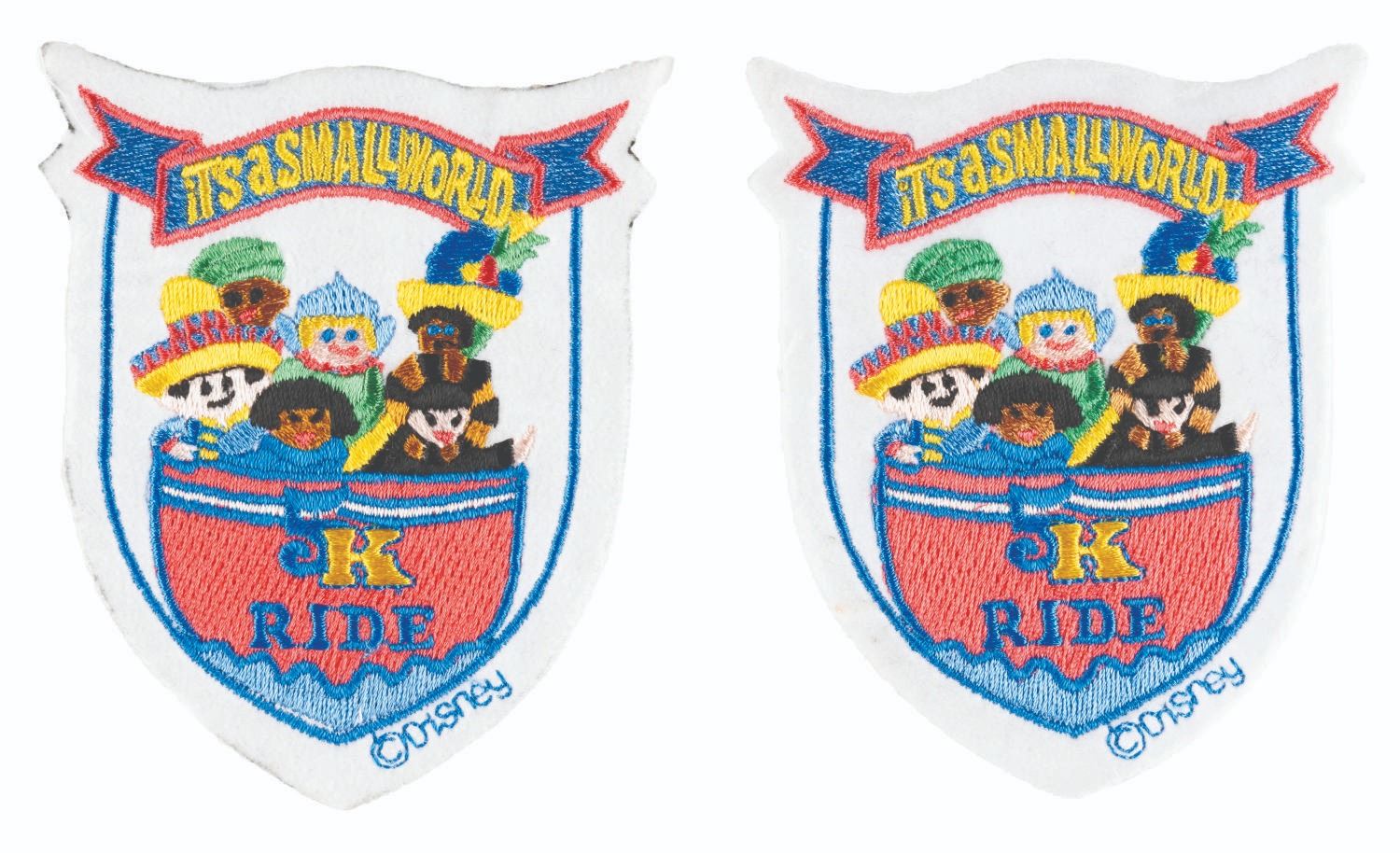 (Disneyland, 1990s) A pair of commemorative patches for the It's a Small World 5k Ride. This after-hours event was exclusive to Cast Members and their friends and family as an opportunity to raise money for charity. Those participating rode the attraction until reaching a distance of 5 kilometers. Measuring 3.75” x 3.5”, the patches are in good condition, with one showing slight discoloration along the outer edge of the emblem.