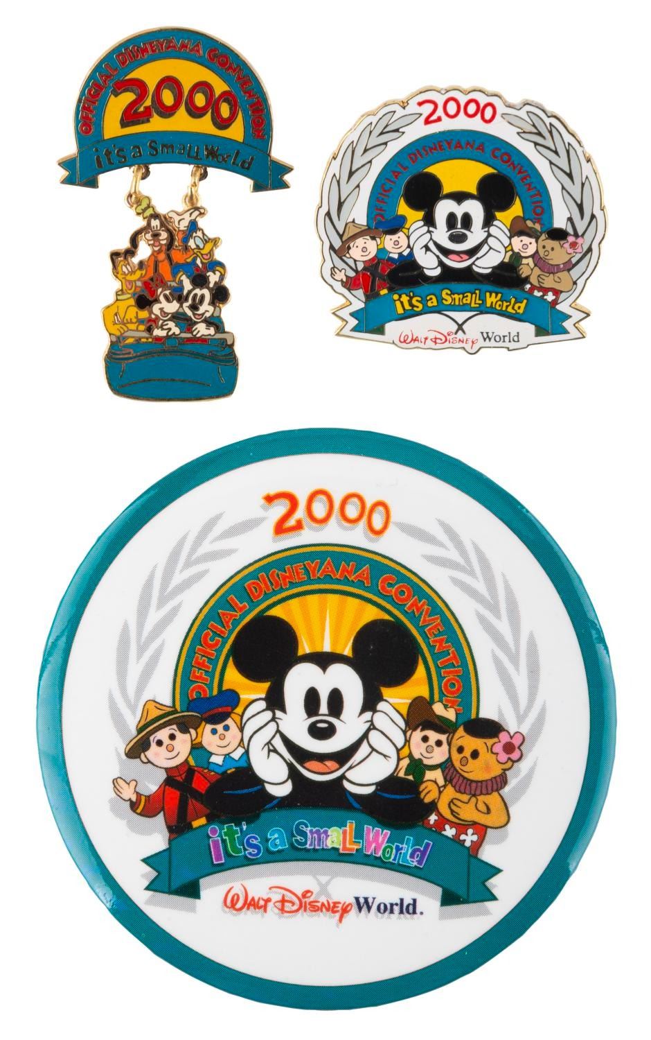 (Disneyana, 2000) A pair of pins and a button from the 2000 "it’s a small world” Disneyana convention at Walt Disney World, including a dangler pin of Mickey and Friends in a small world boat. The pins and button are in very good condition.