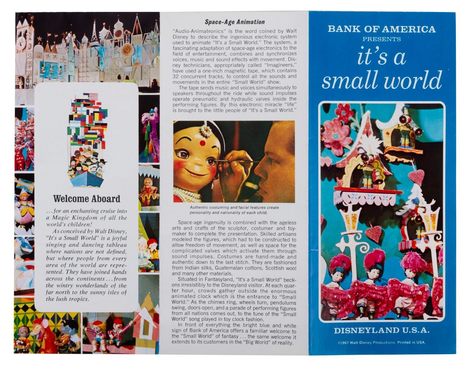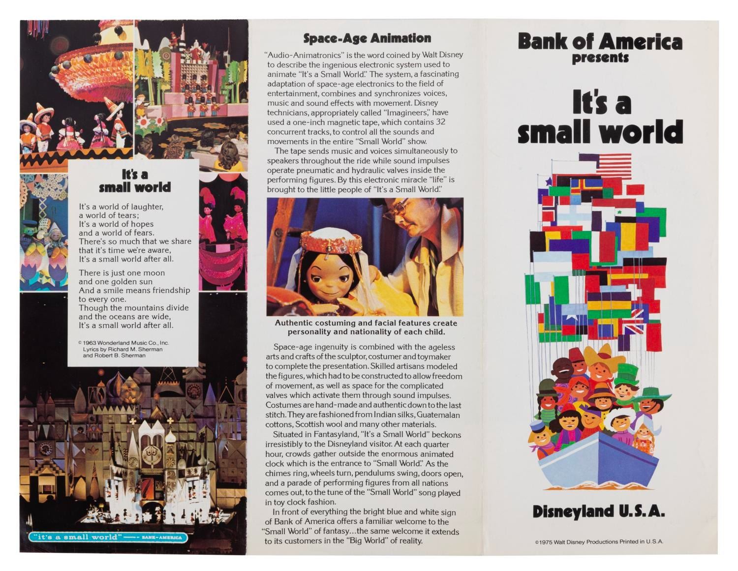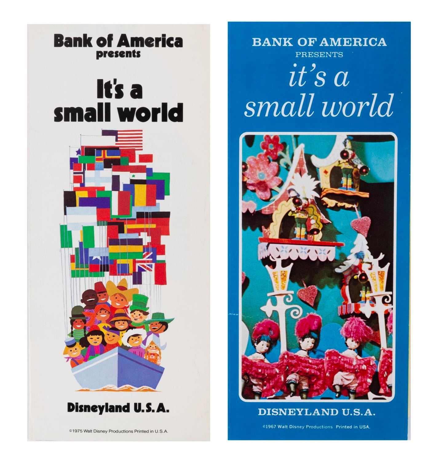 (Disneyland, 1967-75) A pair of souvenir brochures promoting It's a Small World at Disneyland, sponsored by Bank of America. The highlights include a colorful map of the Seven Seaways featuring the Children of the World, and a brief word about "Space-Age Animation" and "the bank that's known the world over." Measuring 3.75"x8.5", each piece is in very good condition with minor wear to its edges, original folds, and corners.