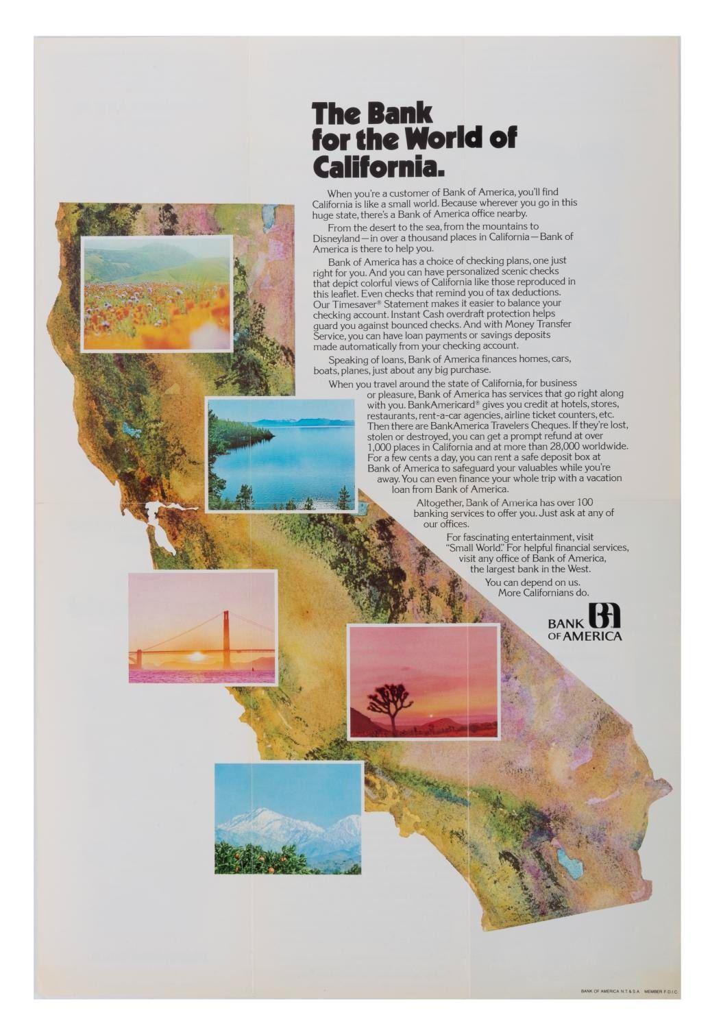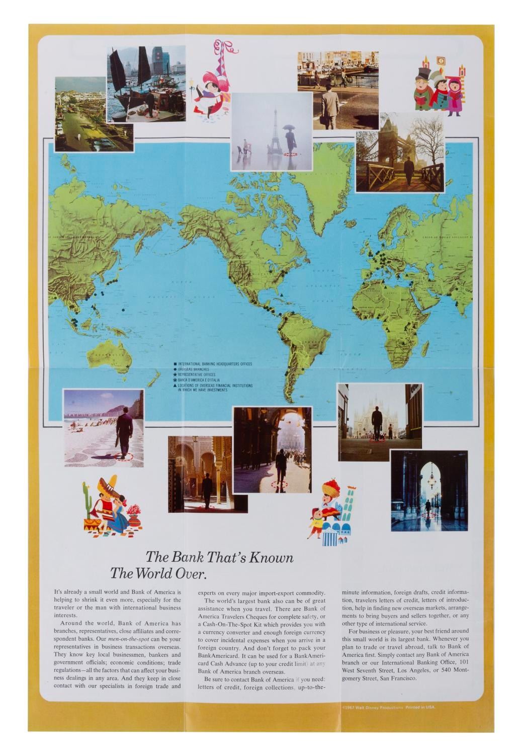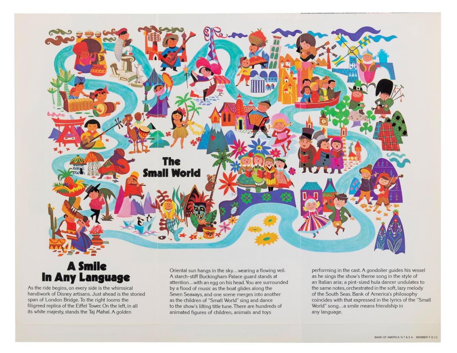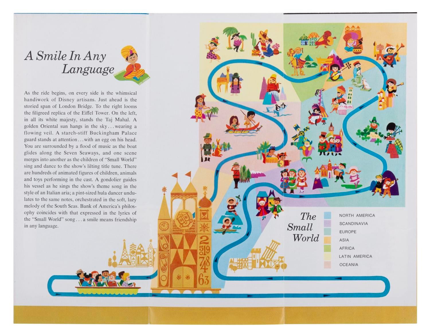 (Disneyland, 1967-75) A pair of souvenir brochures promoting It's a Small World at Disneyland, sponsored by Bank of America. The highlights include a colorful map of the Seven Seaways featuring the Children of the World, and a brief word about "Space-Age Animation" and "the bank that's known the world over." Measuring 3.75"x8.5", each piece is in very good condition with minor wear to its edges, original folds, and corners.