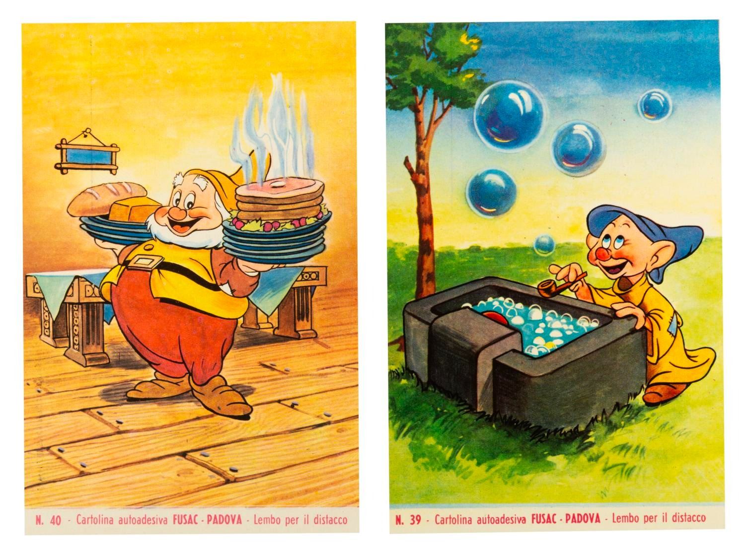 (Mondialcolor, 1960s) A pair of Italian Snow White postcards featuring Happy and Dopey. The entire image can be peeled off and used as a sticker. Measuring 4" x 6.25" each, the unused postcards are in very good condition, with slight ink transfer to the front of the Happy card.