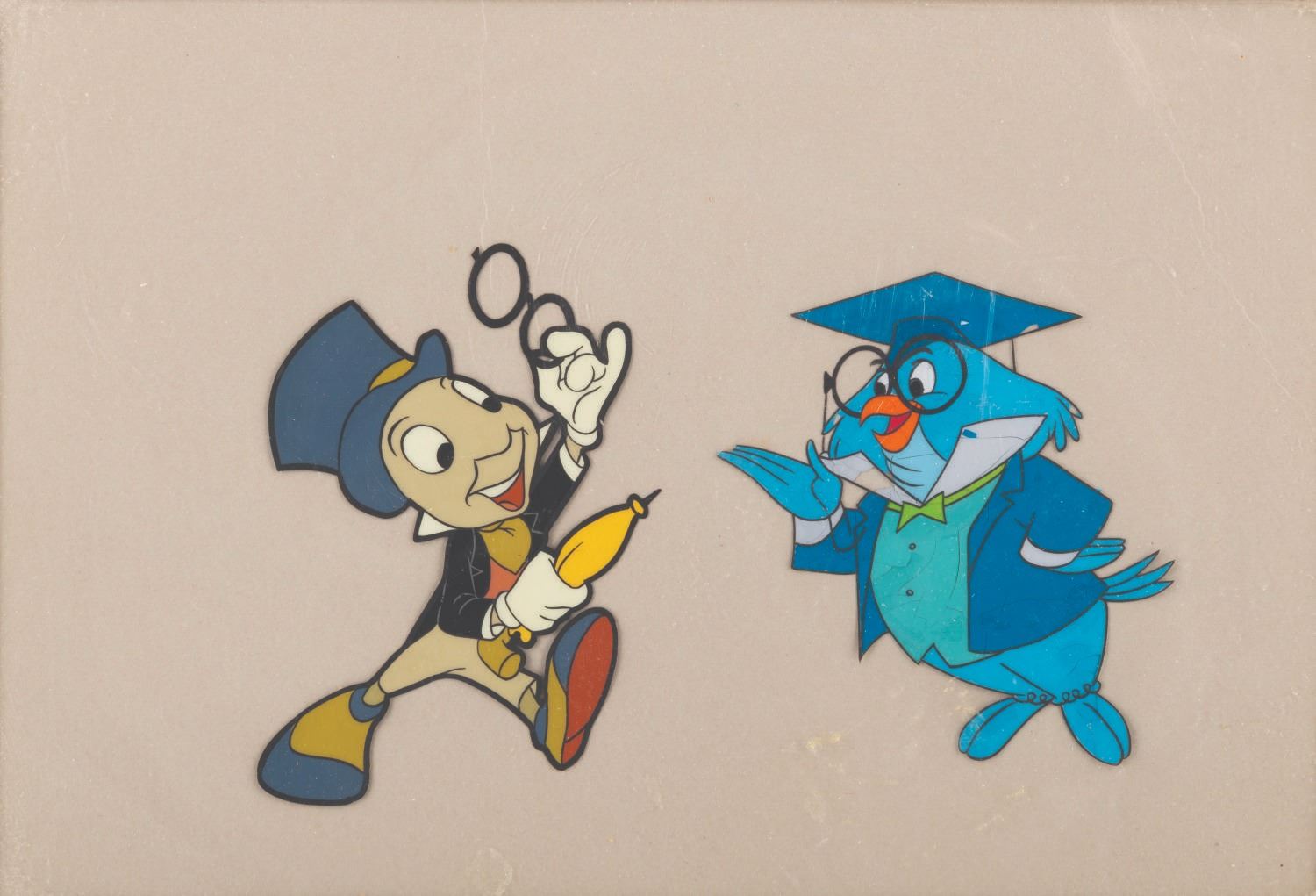 (Disney, 1950s) A pair of Jiminy Cricket and Professor Owl original production cels. The Professor Owl cel is from the March 27, 1959, "Walt Disney Presents” episode "Toot, Whistle, Plunk, and Boom,” and the Jiminy Cricket cel is from one of his many televised appearances. Jiminy has an image size of 2.75” x 4” and Professor Owl has an image size of 3.25” x 3.5” on a 6.25” x 9.25” visible cel. The entire matted piece measures 9” x 12”. The cels are in fair to good condition with heavy cracks to Professor Owl, paint loss, and scratches. The matte displays discoloration from age, edge wear, and spotting.