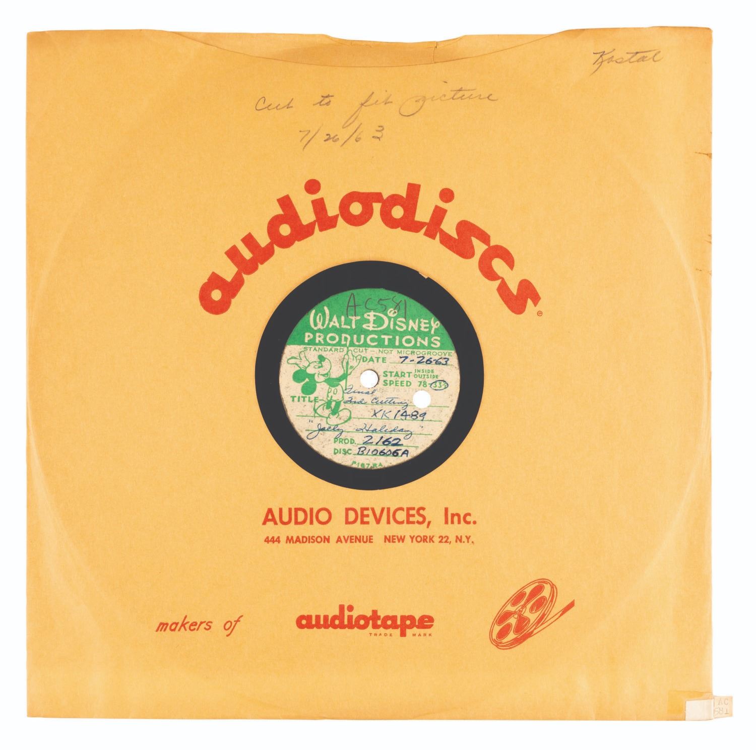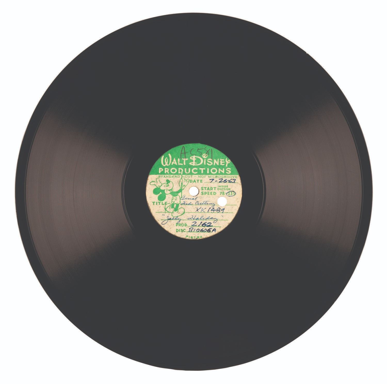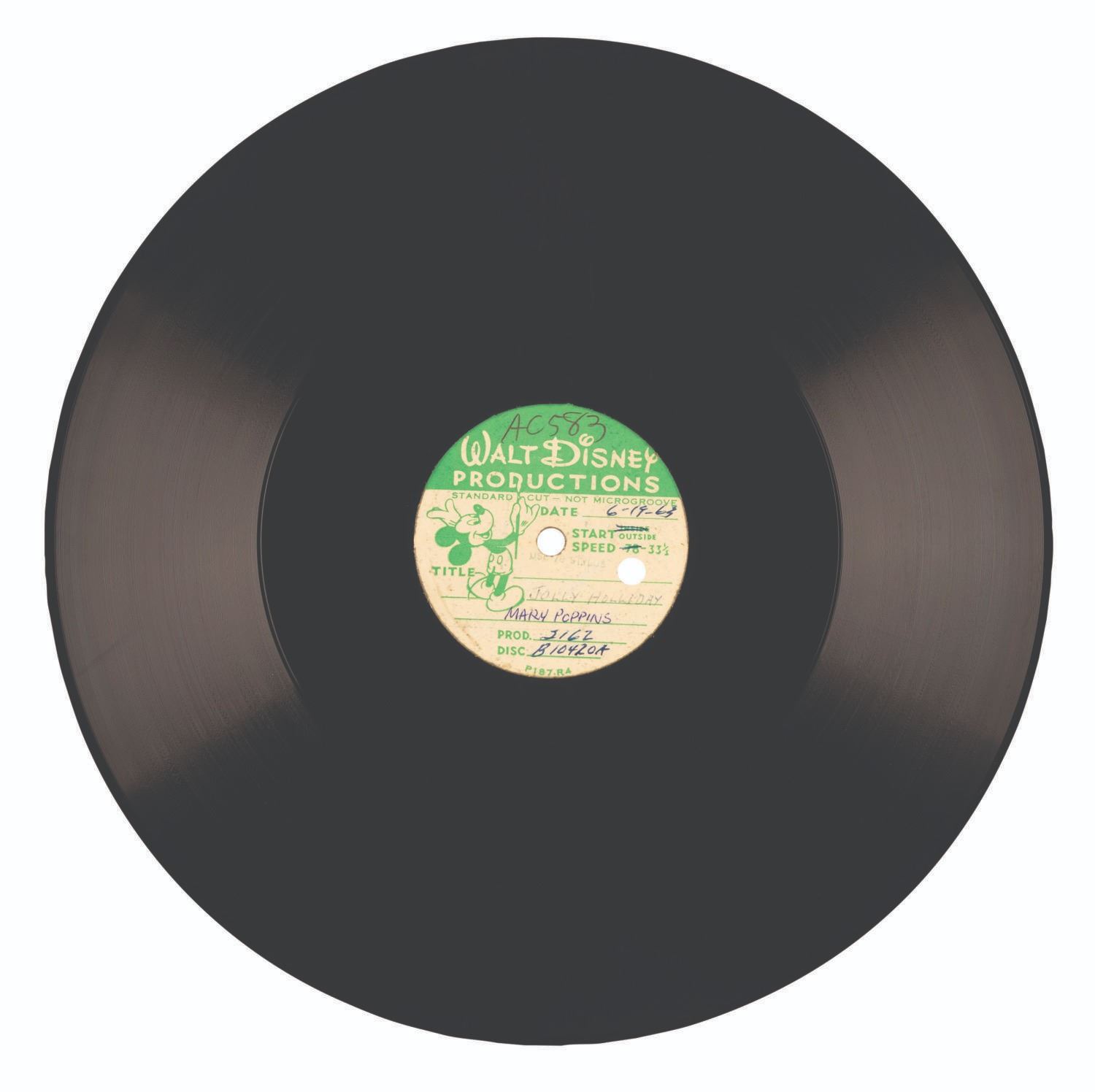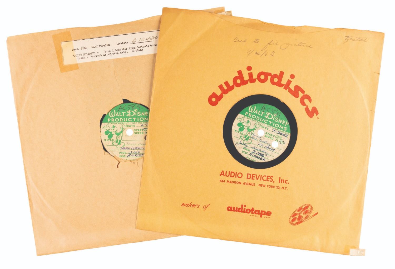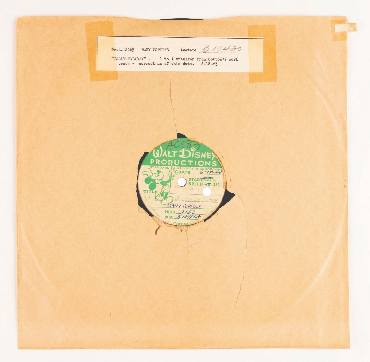 (Disney, 1963) A pair of “Jolly Holiday” acetates pressed for “Mary Poppins” editor Cotton Warburton and conductor Irwin Kostal, recorded on June 19, 1963, and July 26, 1963. Measuring 12” in diameter each, the 33 ⅓ RPM records are in very good condition with light scratches from production use.