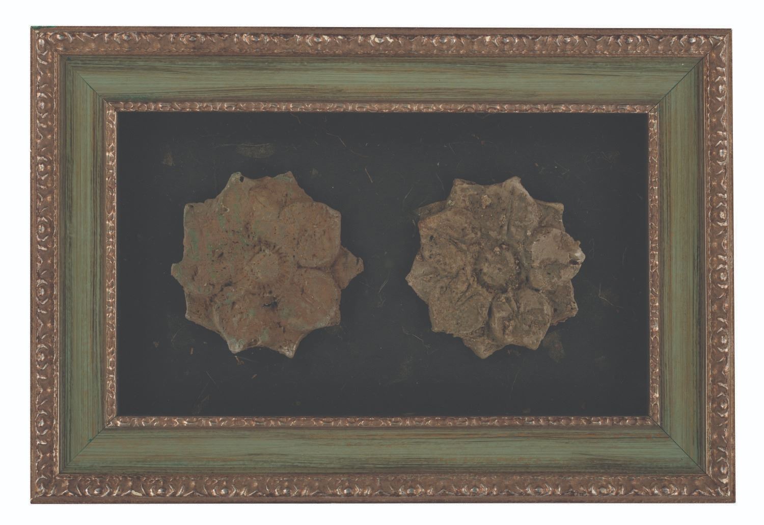 (Disneyland, 1990s-2000s) A pair of original Flower Relief Props from the Jungle Cruise at Disneyland. Encased in a custom frame, these props are related to the upper relief work of the sunken Cambodian temple ruins along the Mekong River stretch. The floral carving facsimiles measure approximately 4.5" in diameter within their 18” x 12” shadowbox and are in very good condition with some wear from outdoor Park display.