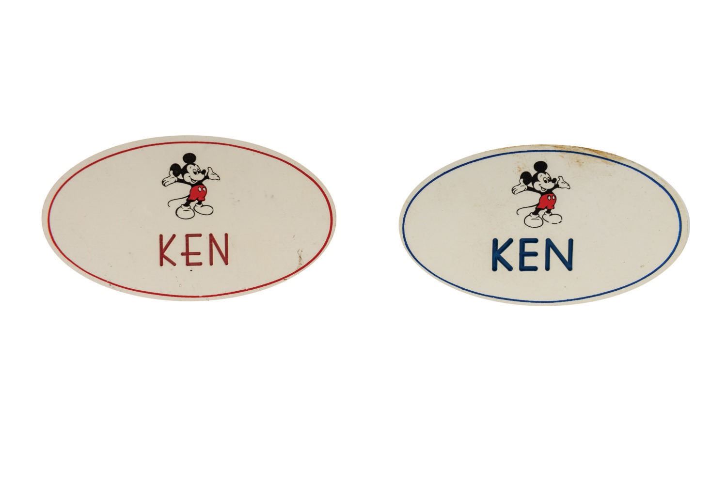 (Walt Disney Studios, 1980s-90s) A pair of Disneyland name tags belonging to Imagineer Ken O'Brien. Measuring 1.5"x2.5", the badges are in very good condition despite few spots of discoloration, scuffs, and slight wear.