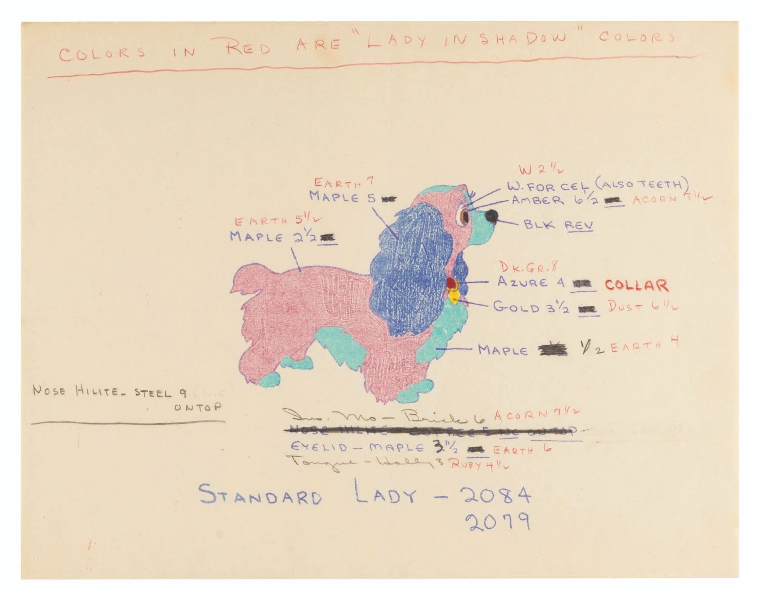 (Disney, 1955) A pair of color model sheets for the title characters of “Lady and the Tramp.” These sheets acted as a guideline to help animators achieve color continuity with each character. With character images measuring 4.75" x 7.25" and 3.5" x 4.25" on 8.5" x 11" trimmed animation paper, these pieces are in very good condition with very light edge wear, staple marks in the bottom left corner of each, light creasing, and discoloration from age.