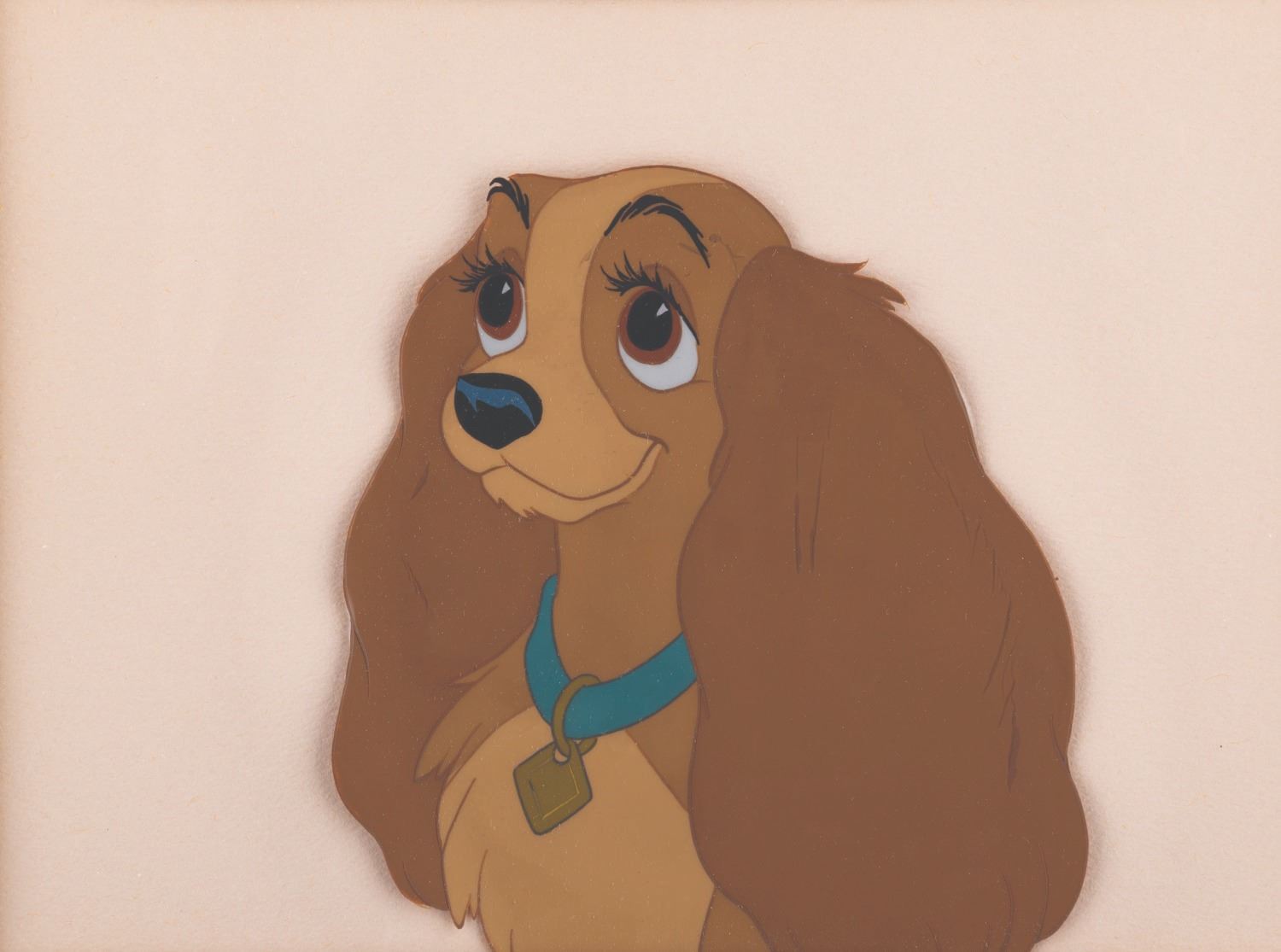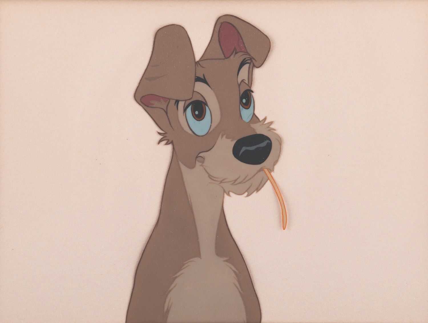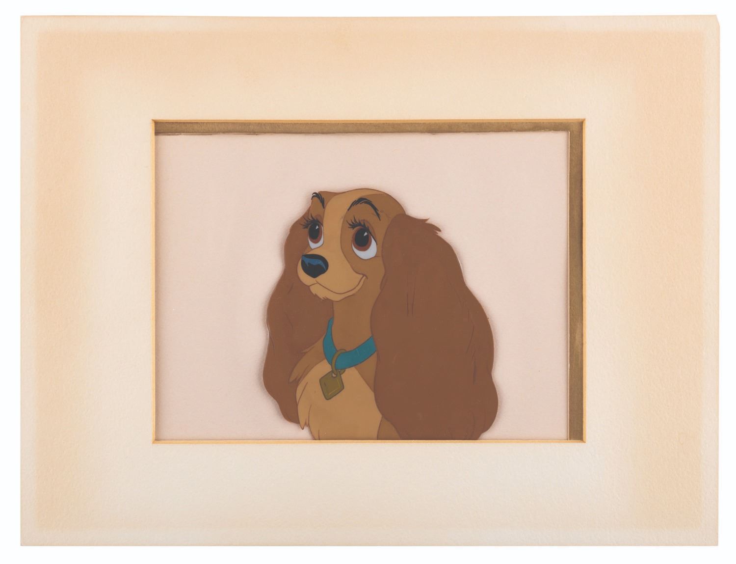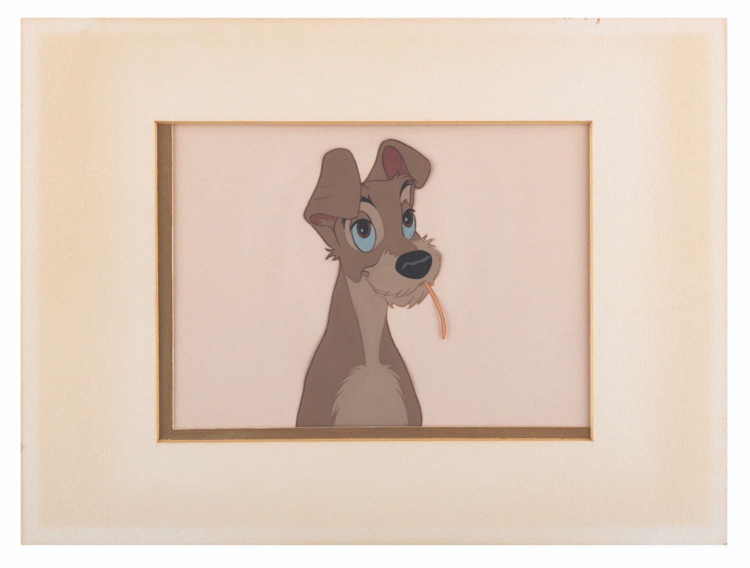 (Disney, 1955) A pair of original production cels of "Lady and the Tramp.” This pair was originally sold at the Art Corner in Disneyland and each comes with the original Art Corner gold labels on the reverse. Lady has an image size of 4” x 4.25” and Tramp 2.75” x 5”, each in a visible 5.25” x 7” window of a 9” x 12” matte. Lady displays in good condition with heavy scratches, Tramp is in good condition with scratches, and both mattes exhibit heavy discoloration from age.
