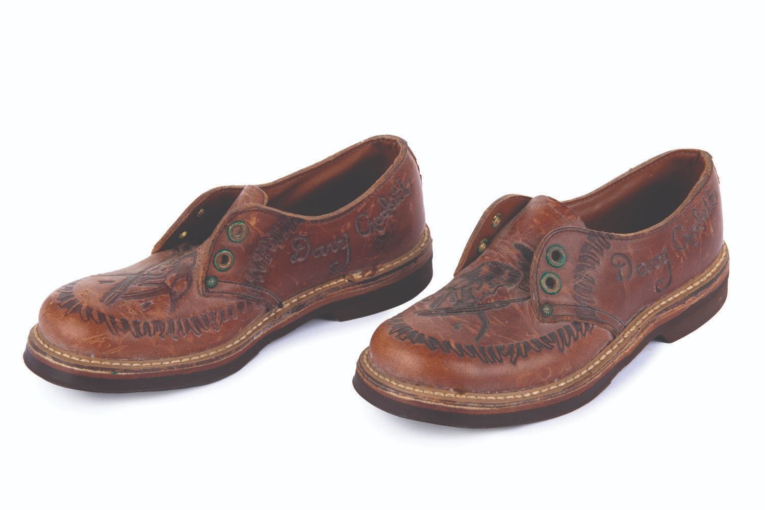 (1950s) A pair of sturdy children's shoes, decorated with Davy Crockett's name and likeness. Labeled only "Built for long wear" on the sole, these sturdy and heavy shoes measure 8" long. They appear unworn, with soles unmarked, but scuffs and scratches to the leather surfaces, spots of verdigris to brass lace rings, and the original leather laces brittle and broken from age.