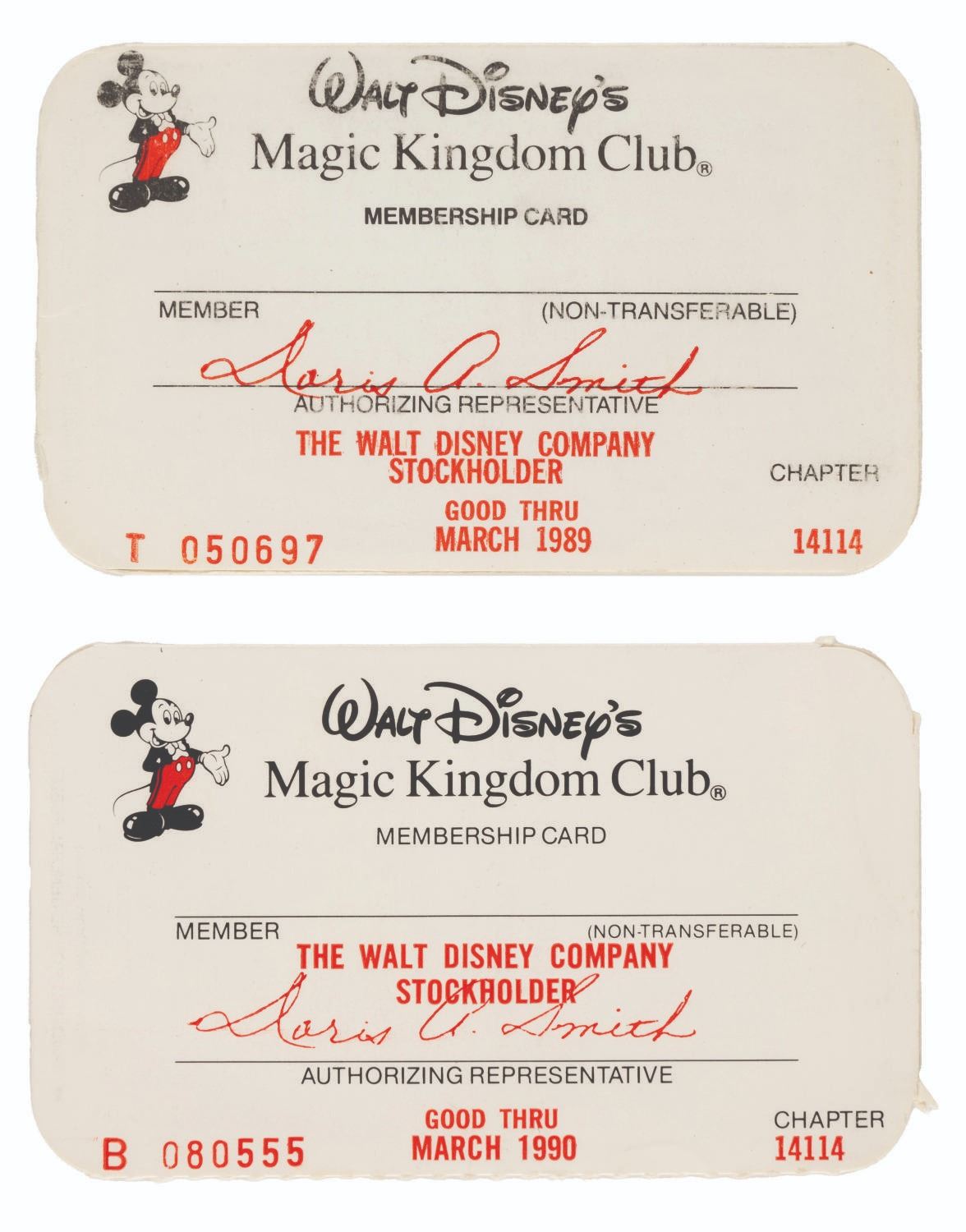 (Disney, 1988-90) A pair of unused Walt Disney’s Magic Kingdom Club membership cards. These cards granted their holders discounts at the Parks and Hotels. Both are signed by authorizing representative Doris A. Smith in red ink and stamped "The Walt Disney Company Stockholder." Measuring 2.25" x 3.75" each, the cards are in good condition with ink loss, creases, handling wear, and discoloration from age.