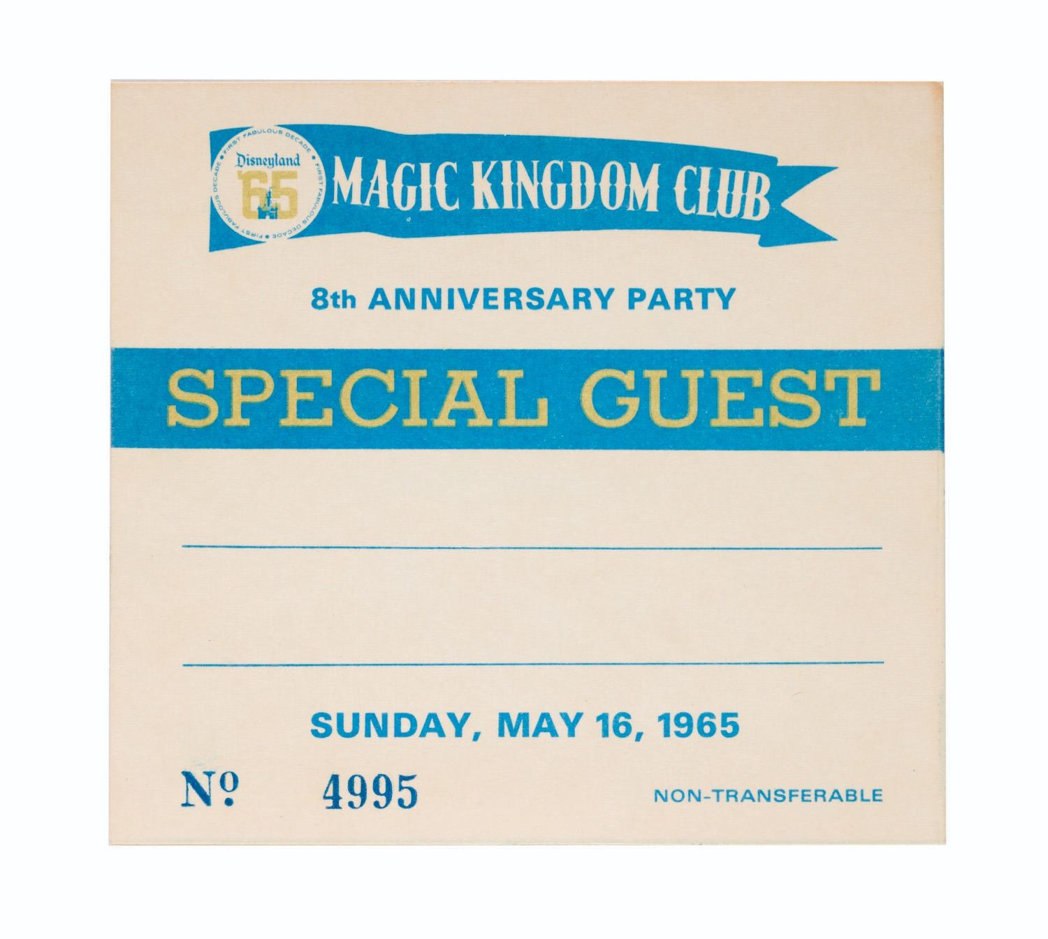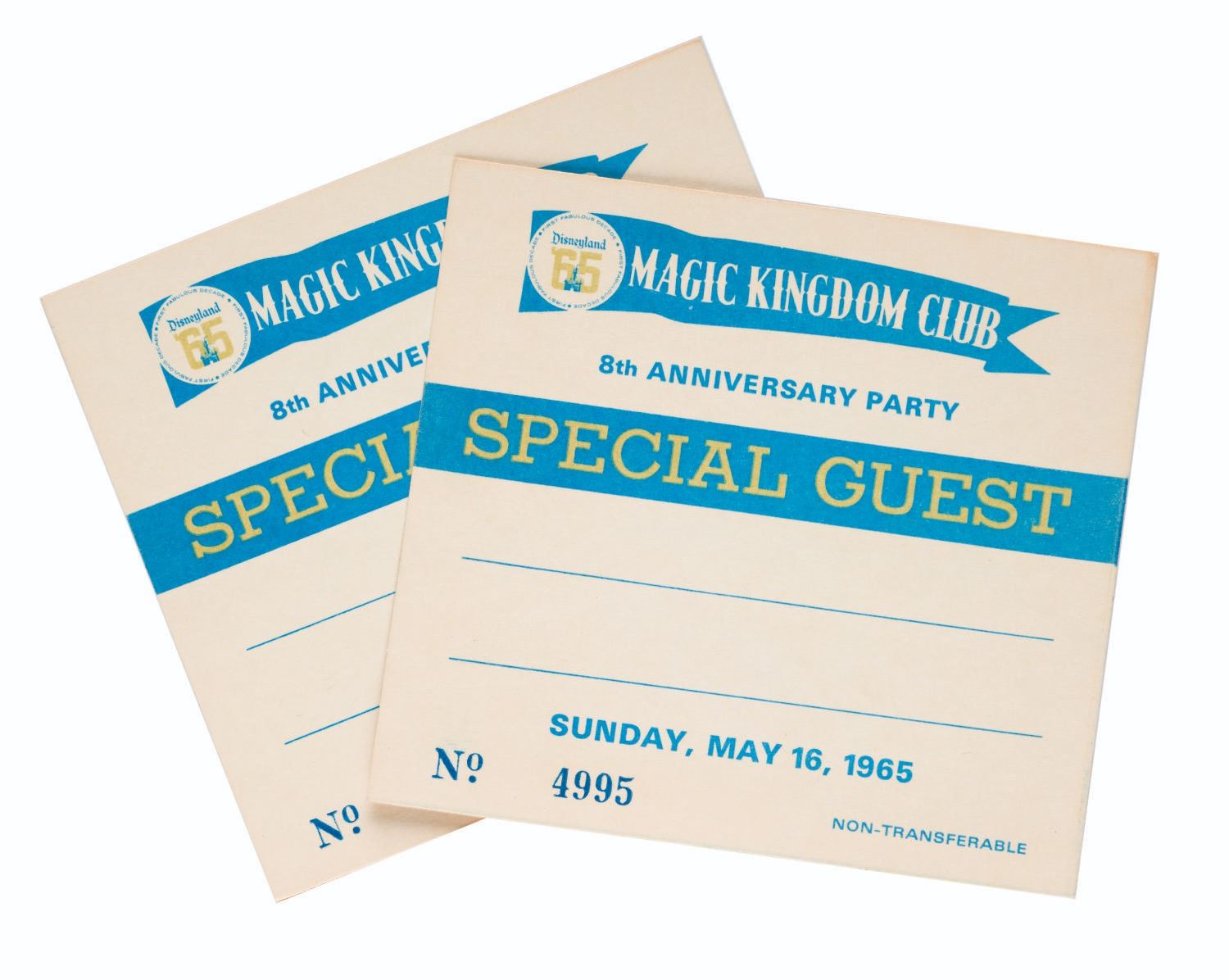 (Disneyland, 1965) A pair of Magic Kingdom Club Special Guest Passes to the Disneyland 8th Anniversary Party. Measuring 4” x 4.5”, the passes have consecutive numbers and are in fine condition.