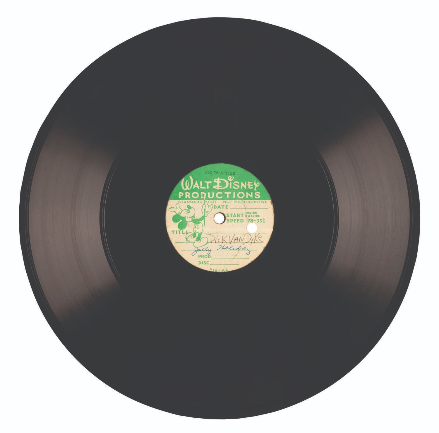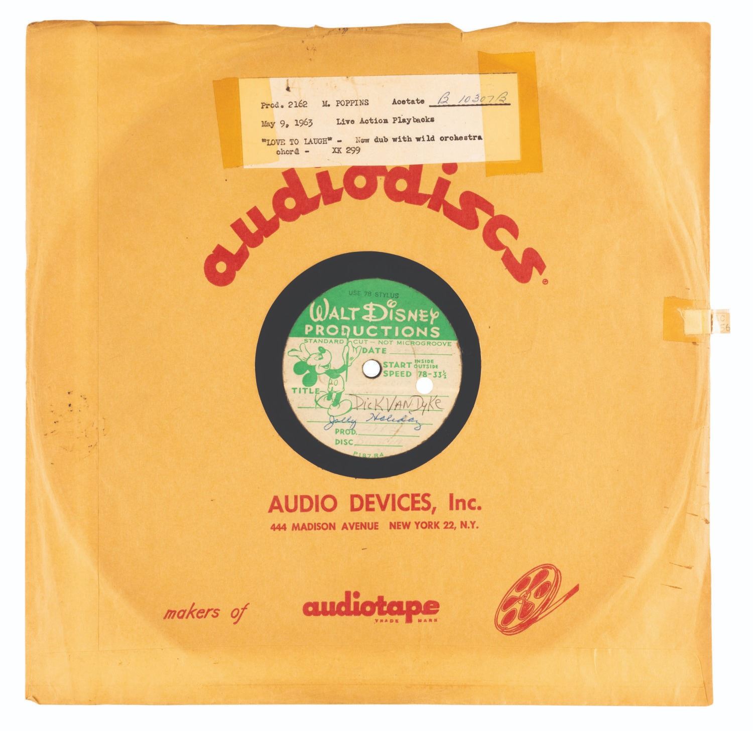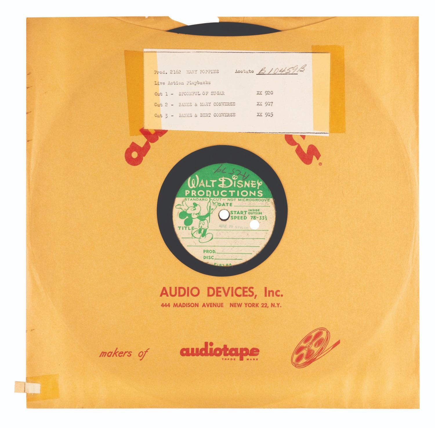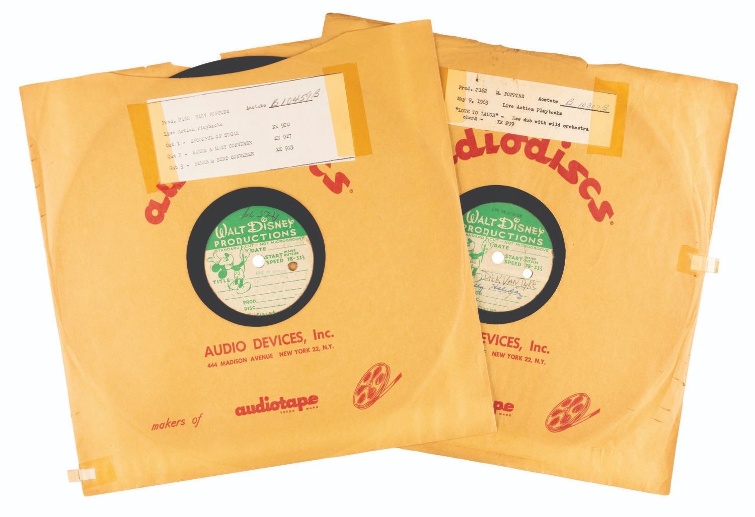 (Disney, 1963) A pair of “Mary Poppins” acetates pressed for live-action playback including “Jolly Holiday” “A Spoonful of Sugar,” “I Love to Laugh,” and “Let's Go Fly a Kite.” The songs were prerecorded and played on set during filming while the actors lip-synched for the camera. One record is dated “May 9, 1963,” only the third day of production, very early in the making of one of the most beloved musicals of all time. Measuring 12” in diameter, the 33 ⅓ RPM records are in good condition with scratches, scuffs, and several chips at the edges.