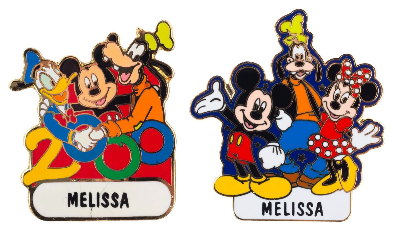 (Walt Disney World, 1990s-2000s) A pair of personalized "Melissa” name pins featuring Mickey, Donald, Minnie, and Goofy. The pins are in very good condition.