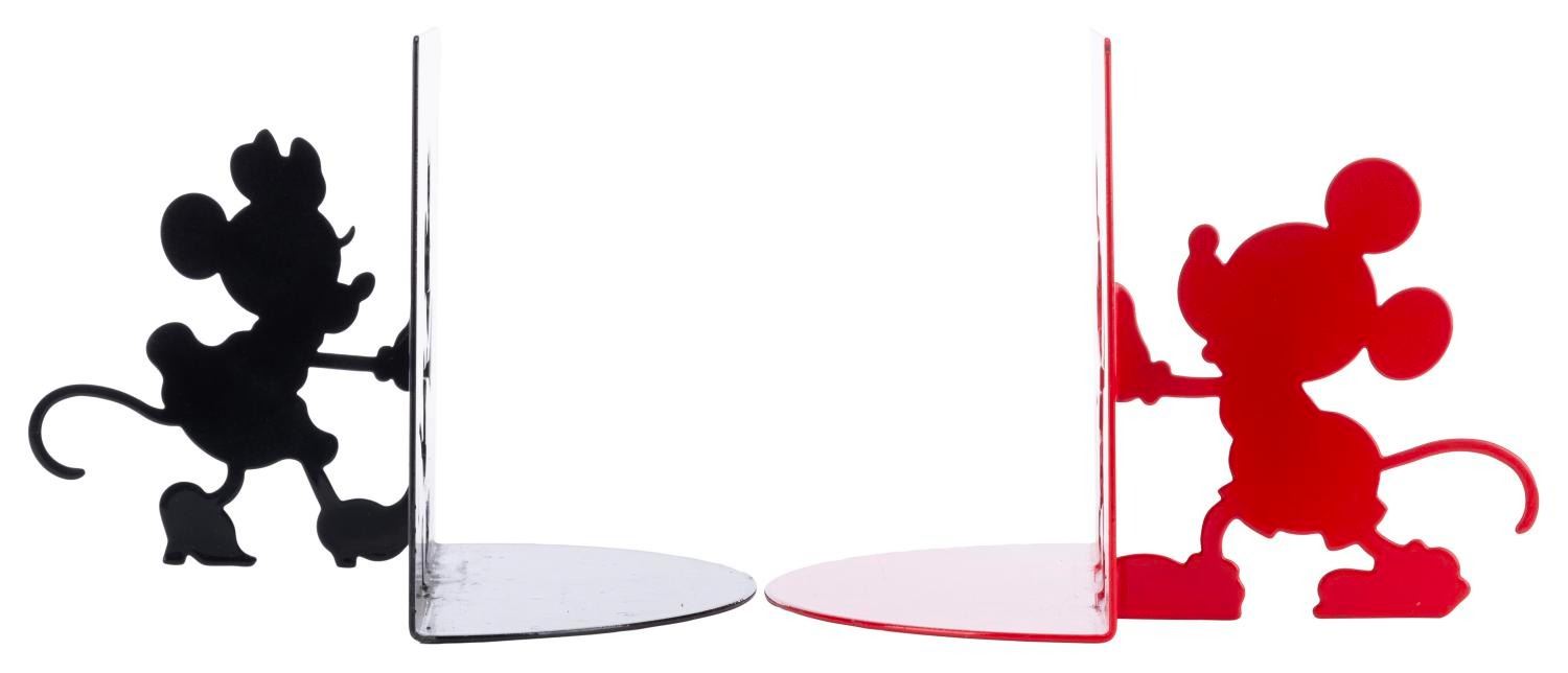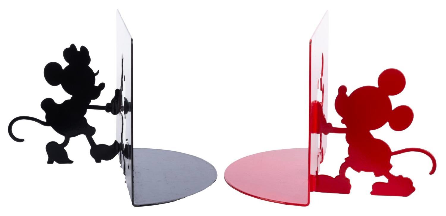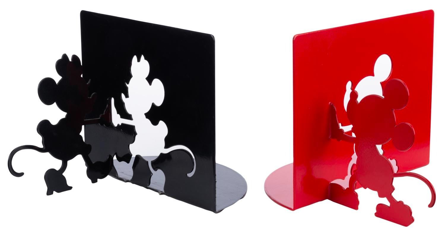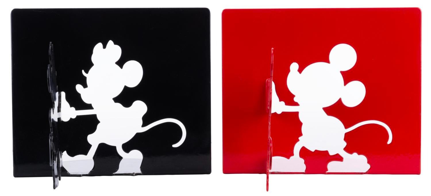 (Moller Design, 1990s) A pair of The Mickey Mouse Collection metal bookends featuring Mickey and Minnie Mouse, designed by Michael Graves. Each measuring 6.5" x 7.5" x 5.5" high, the bookends are in very good condition with light wear from use.
