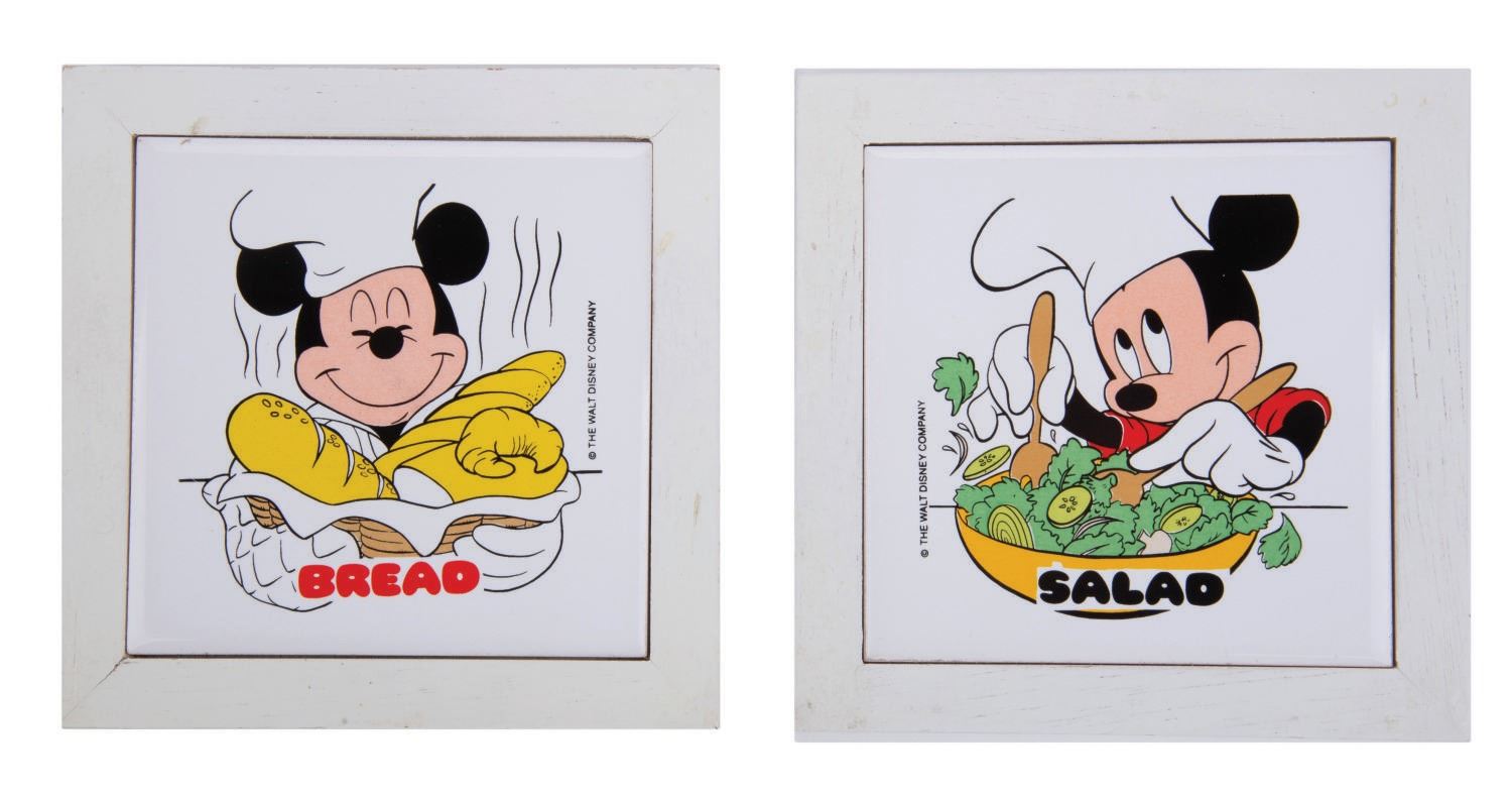 (Disneyland, 1990s) A Pair of decorative Mickey Mouse ceramic tile trivets mounted on wood. The pieces are in fine unused condition.