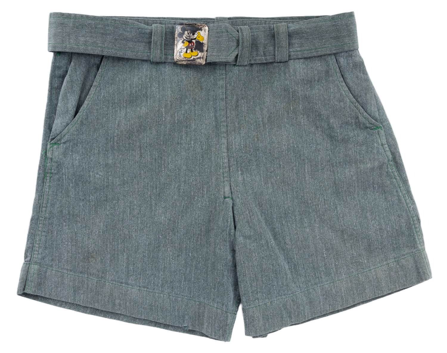 (Kaylee, 1950s) A pair of children’s short pants with a Duroplate buckle featuring Mickey Mouse. Measuring a size “5,” the garment is in good condition with scuffs and wear and retaining its original Kaylee Mickey Mouse label.