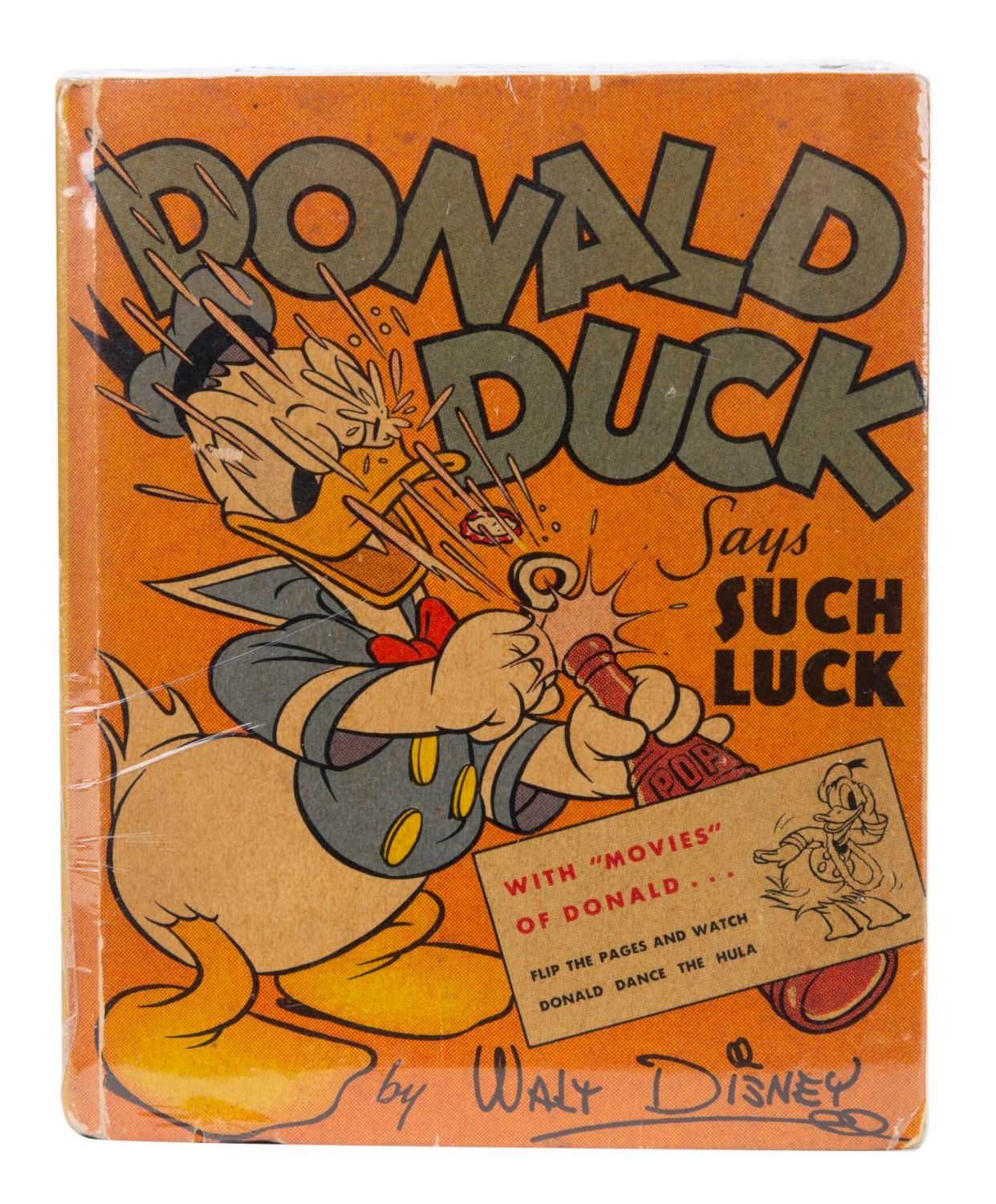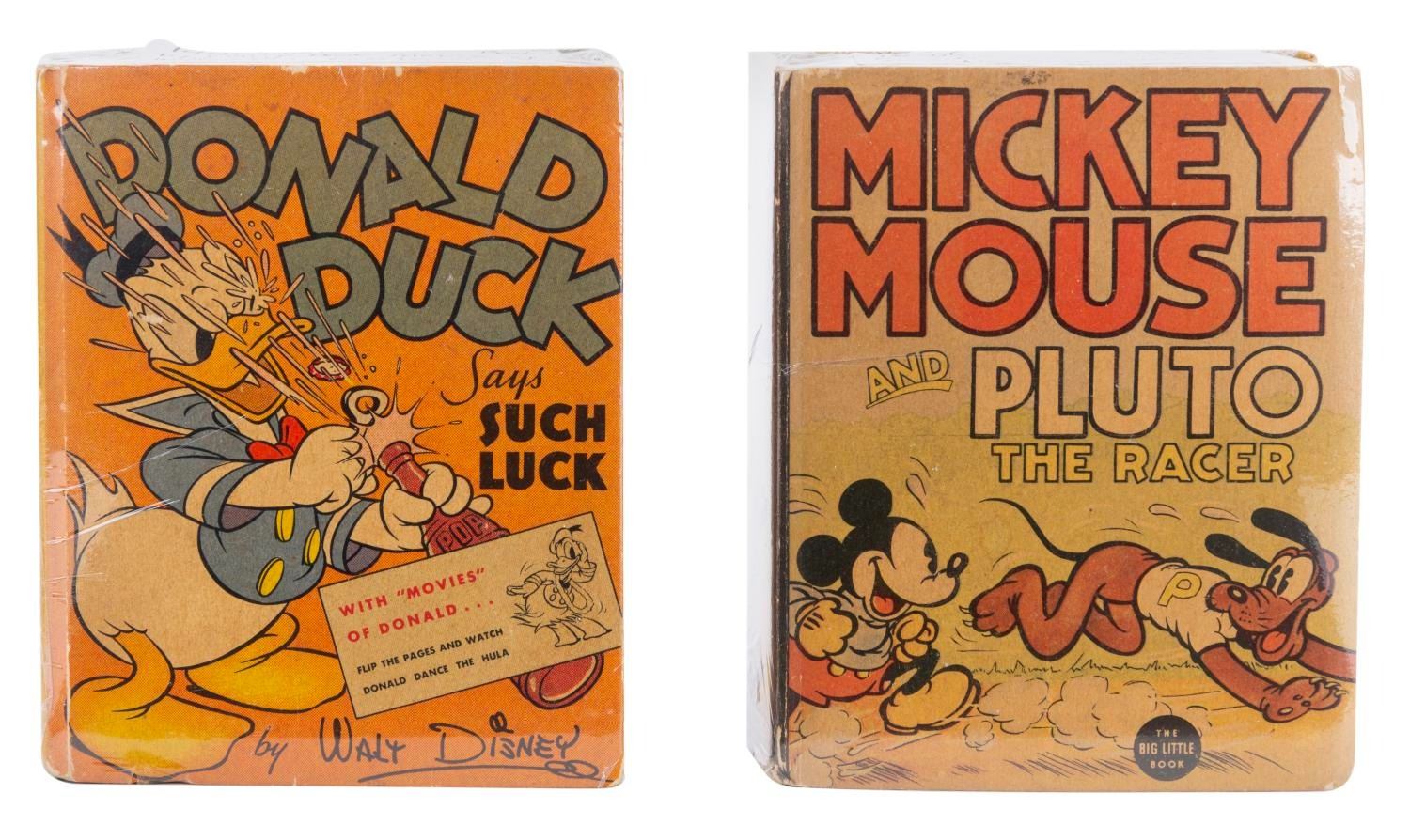 (Whitman, 1950s-60s) A Pair of Mickey Mouse & Donald Duck Books. Among this lot are “Mickey Mouse and Pluto The Racer” Big Little Book, and a “Donald Duck says Such Luck” Better Little Book (with movies of Donald). Measuring various sizes, the publications are in good to very good condition with yellowing, fading, creases, and scuffs.