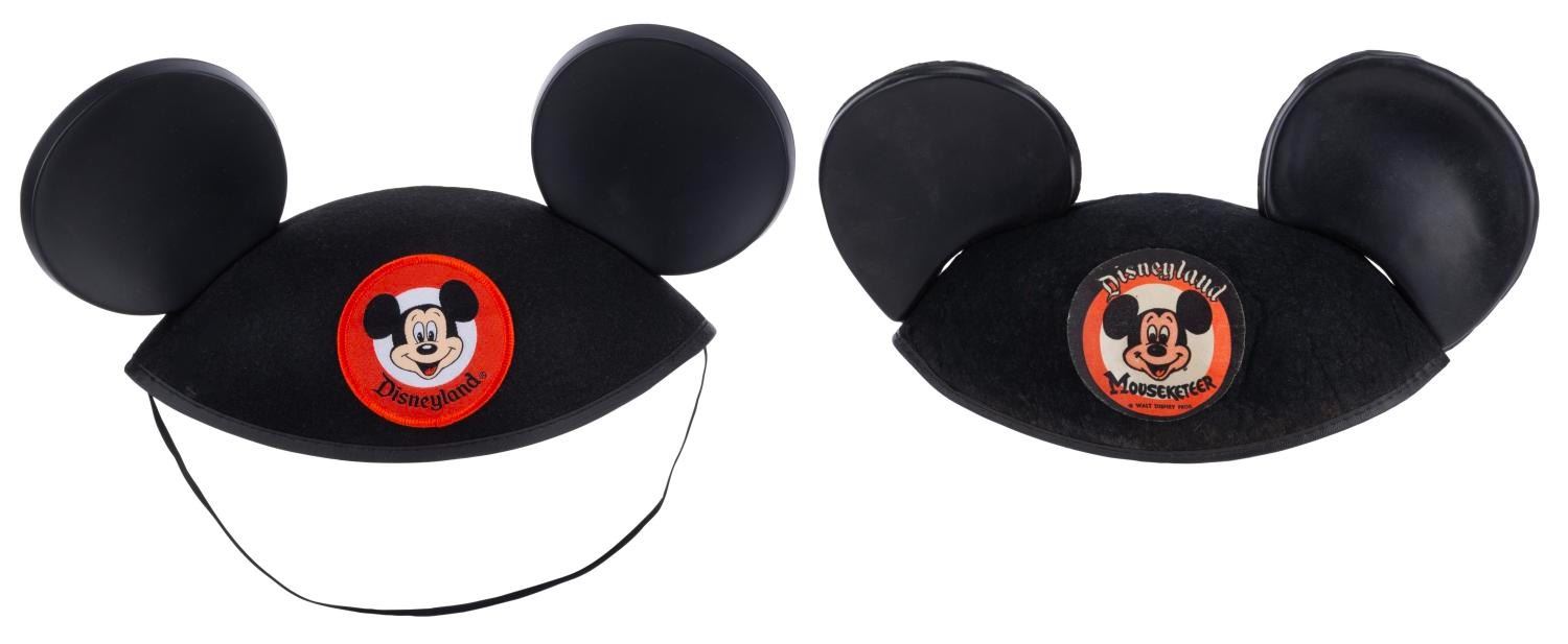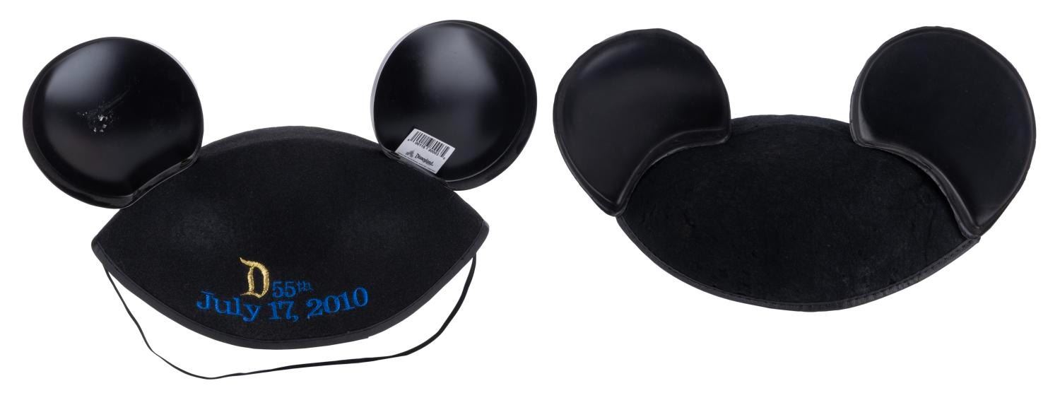 (Disneyland, 1960s-70s/2010) A pair of Mickey Mouse ear hats, one is a Mousketeer version, and the other is a Disneyland 55th Anniversary pair with “D 55th July 17, 2010" embroidered on the reverse. Measuring 5" tall and 6.5"-7" in diameter each, the felt and plastic hats are in very good to fine condition, with the older hat exhibiting light creasing to the felt.