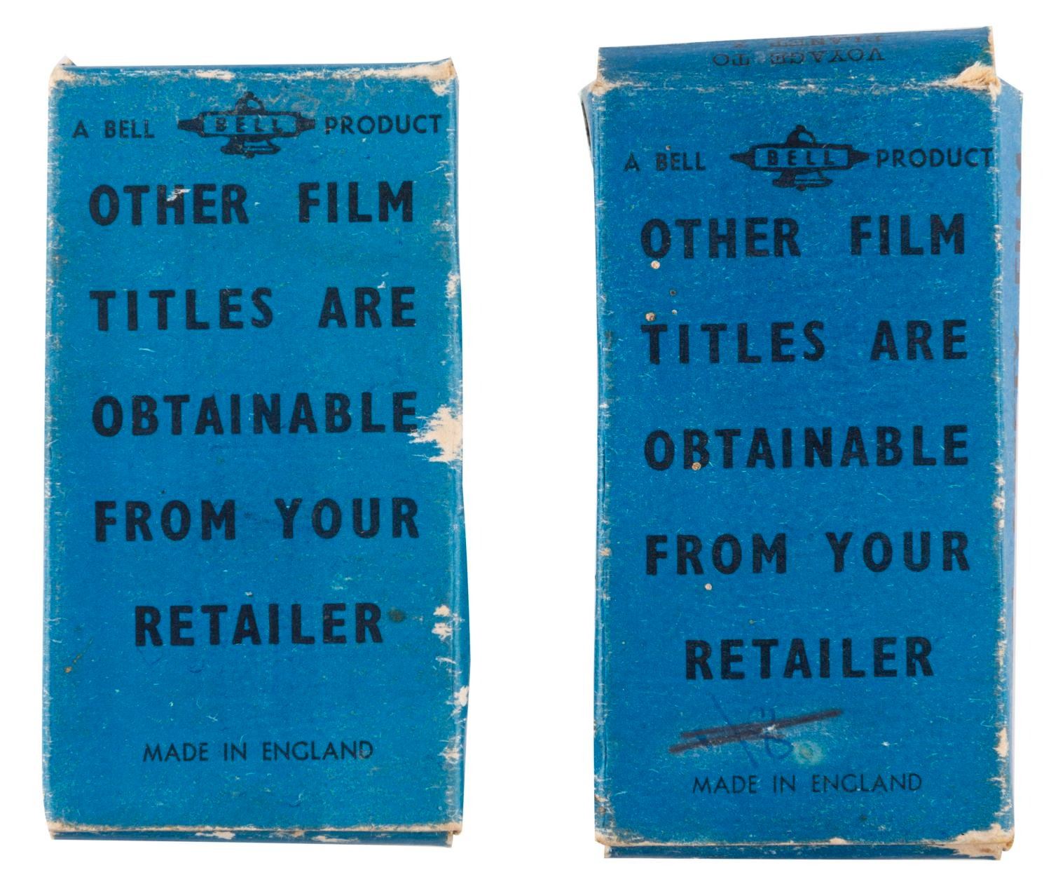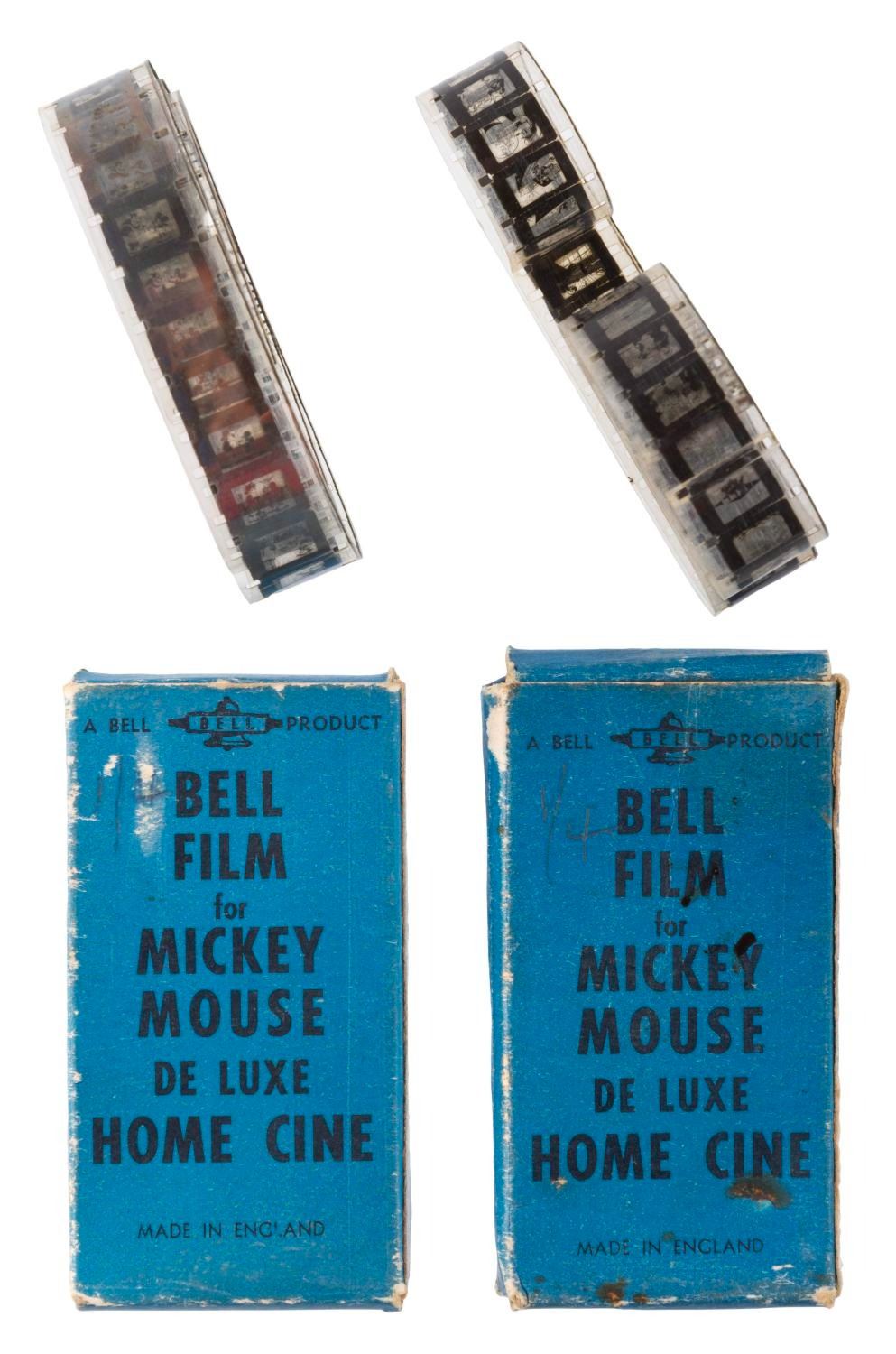 (Bell, 1940s) A pair of Mickey Mouse De Luxe Home Cine films by Bell of England. Each box contains a 16mm film strip loop for a toy home projector. The titles are Donald Duck in “Voyage to Planet X" and “Mickey Mouse in the Big Fight." The film strips are in good condition with wear to the boxes and film from age and handling, and the splice on the Mickey loop broken.