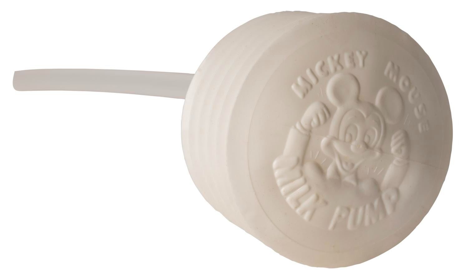 (Morris Plastics, 1950s) A pair of Mickey Mouse plastic milk pumps used to fill a glass from a bottle or carton without spilling. Also included are two incomplete boxes of straws featuring Mickey Mouse and Donald Duck. Measuring from 1" x 3.5" x 8.75" to 3.75" x 3.75" x 11", the items are in good condition with wear to the boxes from use.