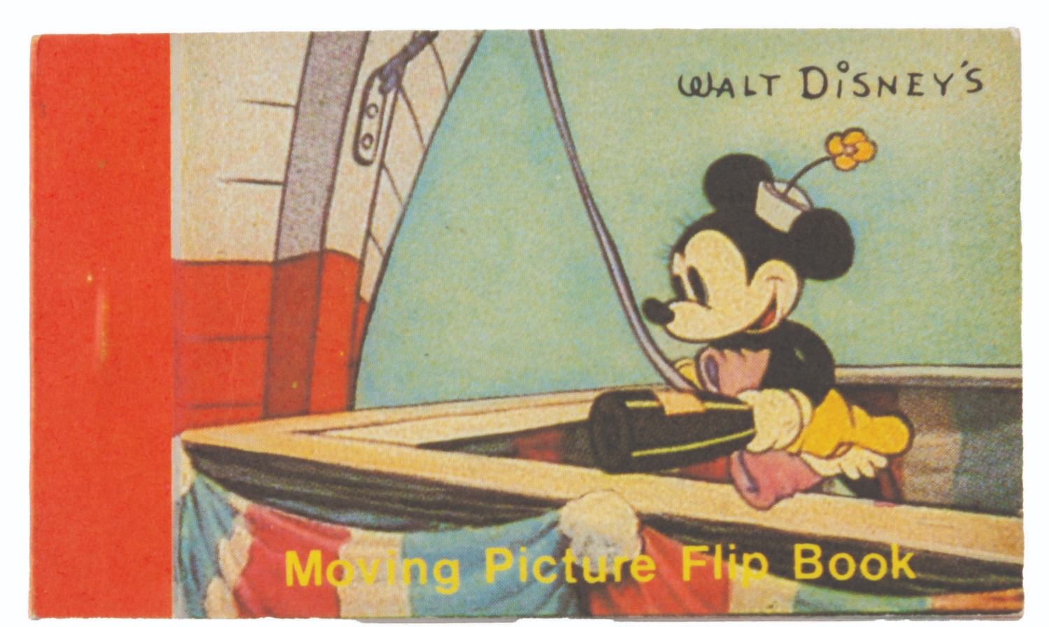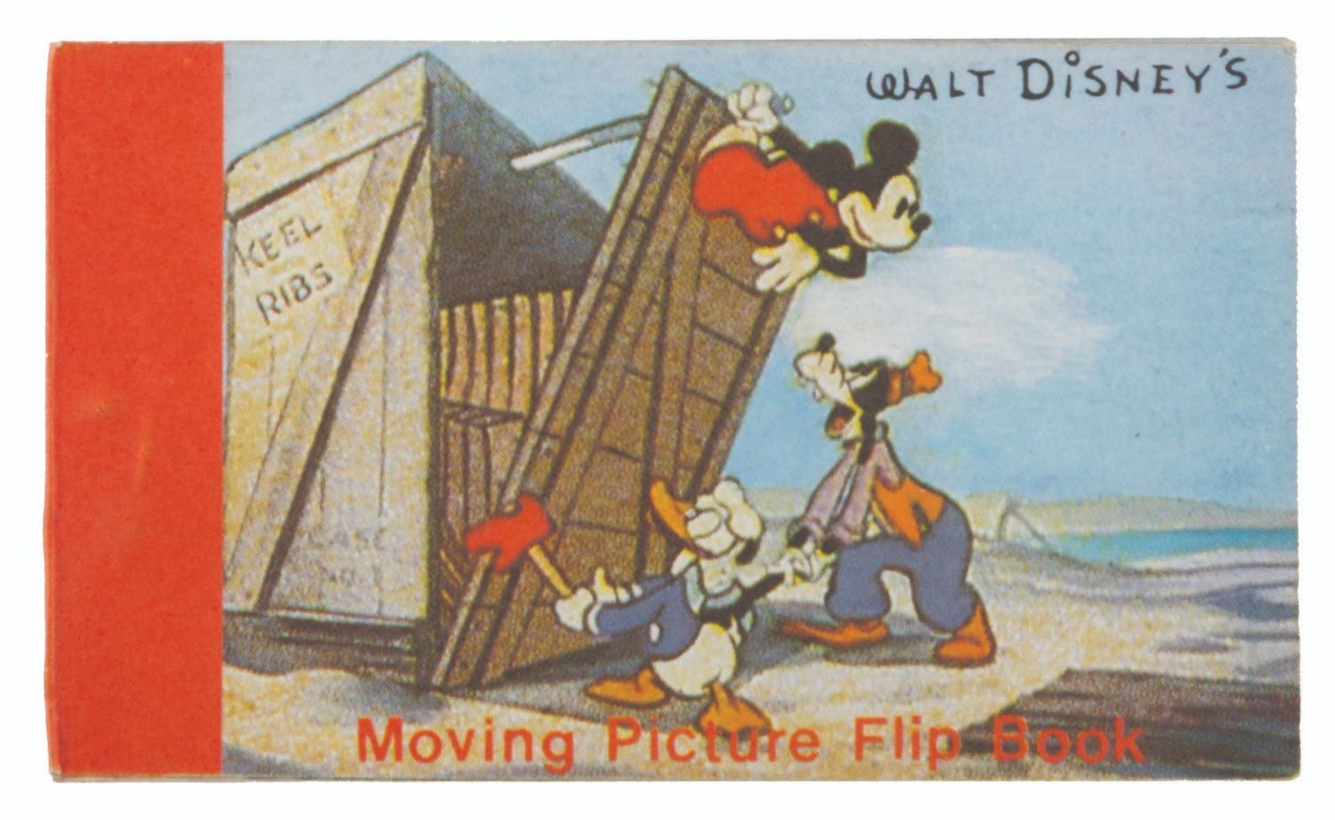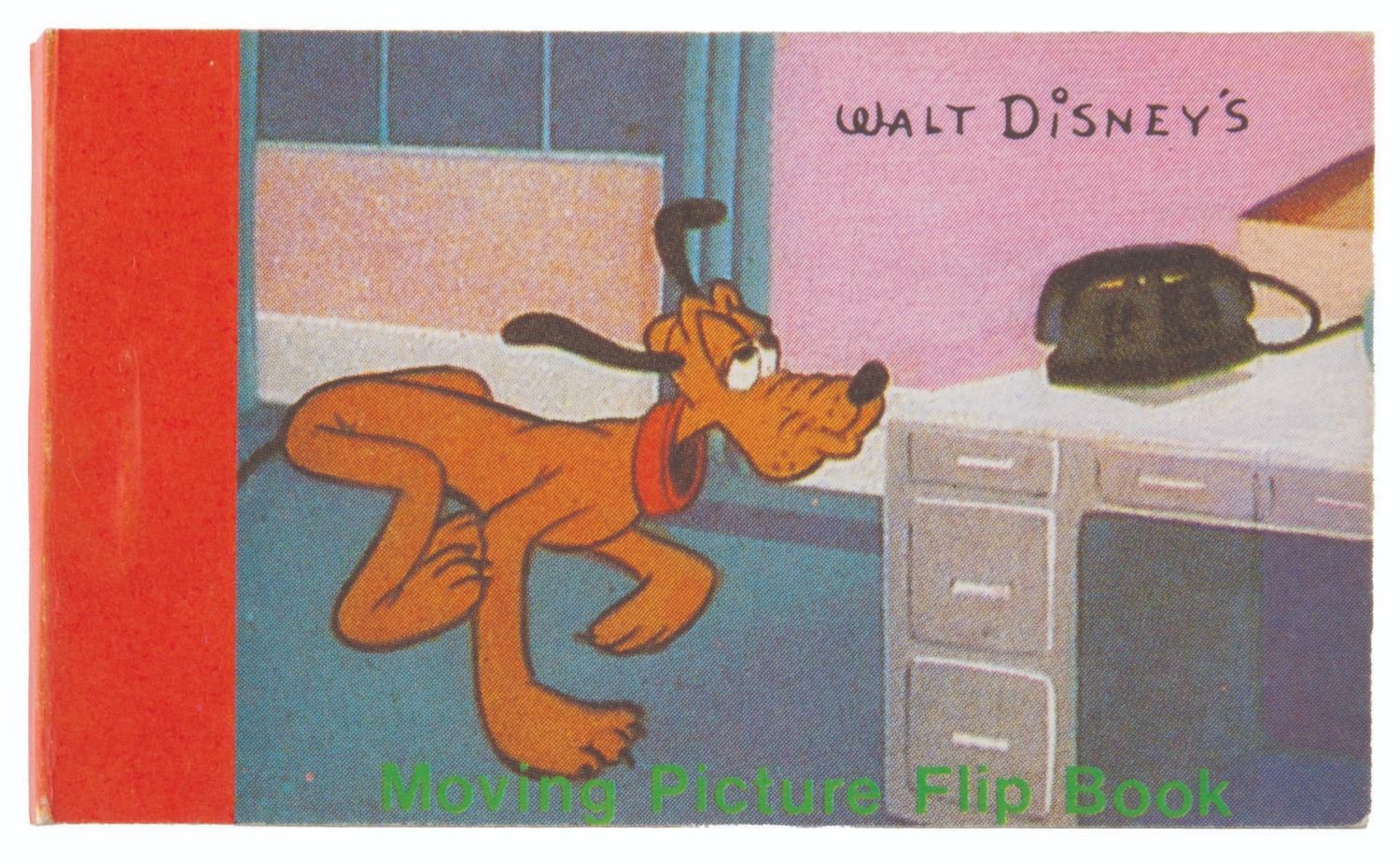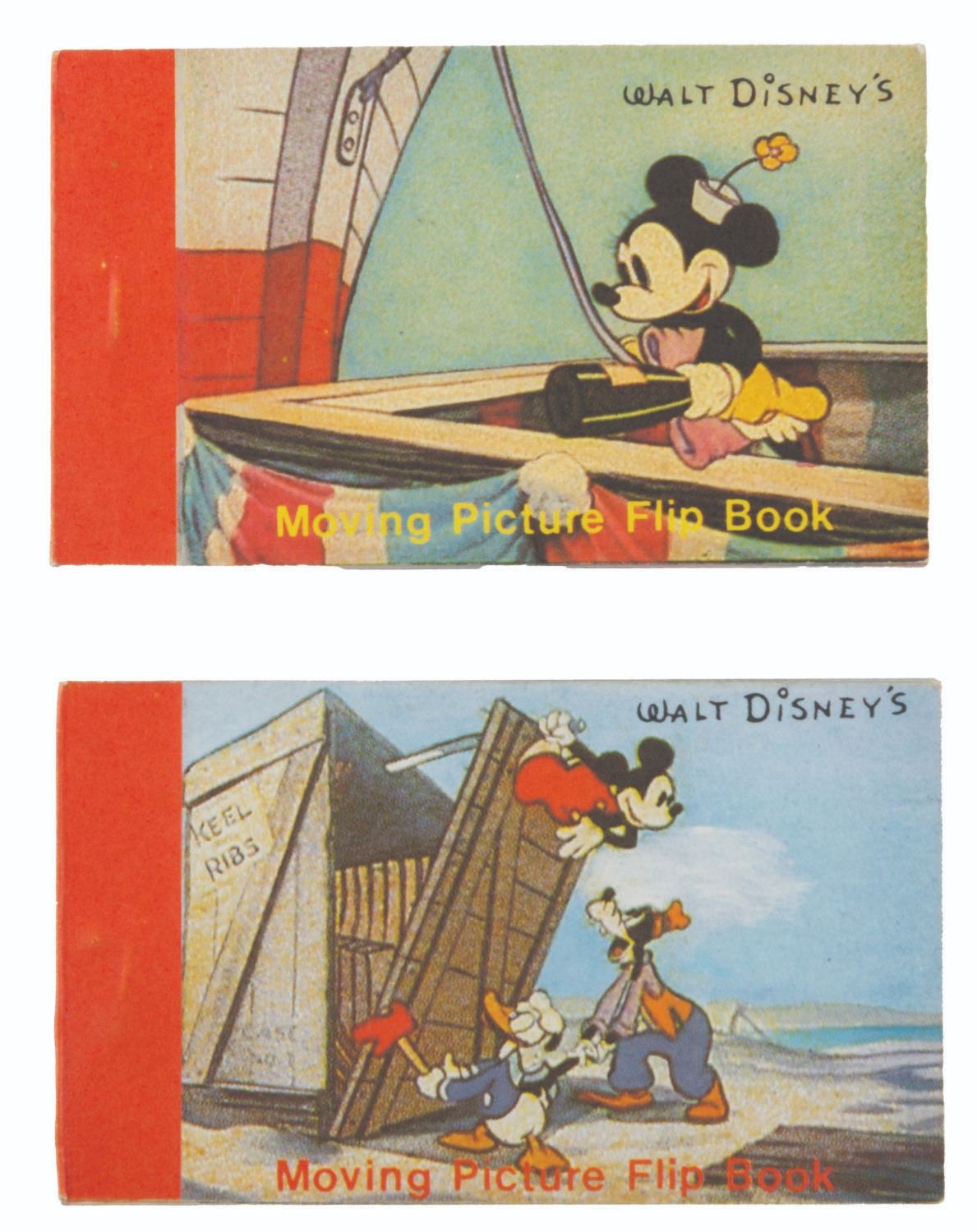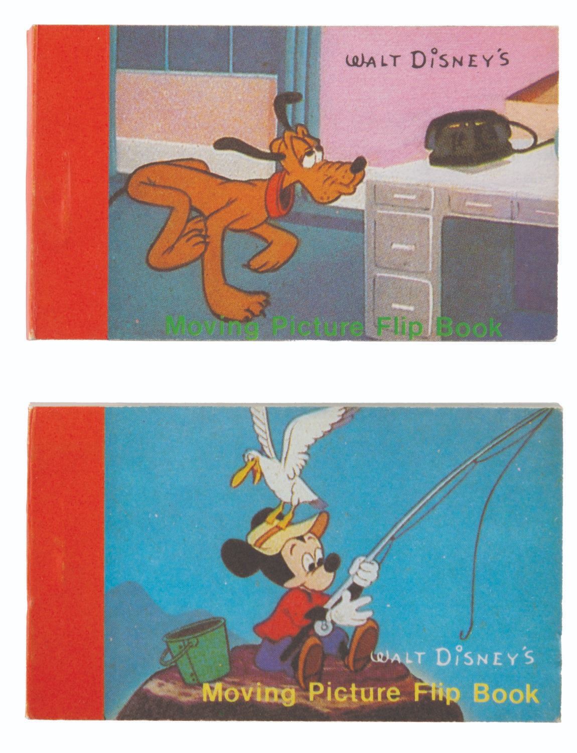 (Disney, 1986) A pair of Moving Picture flip books, each presenting two sequences of animation from Mickey Mouse cartoons "Boat Builders," "The Simple Things," and a sequence of Pluto answering the phone. Each measuring 1.75" x 2.75", the flip books are in very good condition.