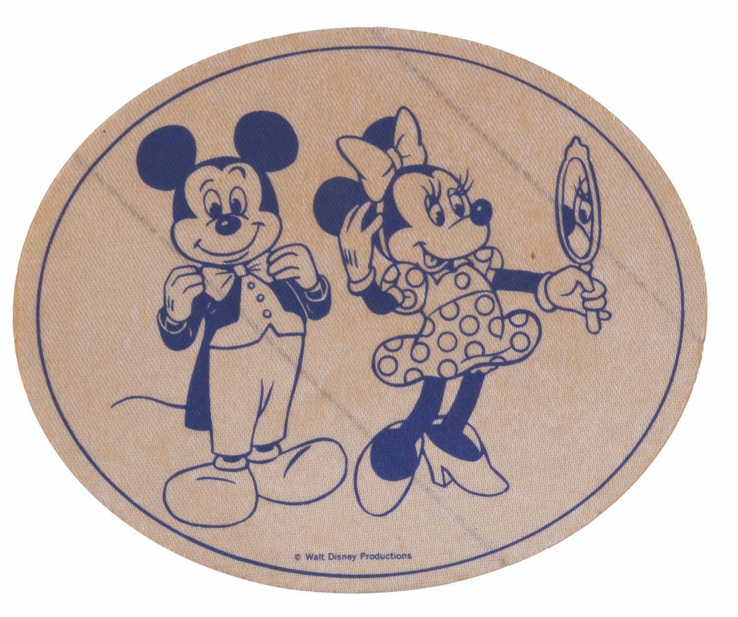 (Disneyland, 1980s-90s) A pair of fabric stickers featuring Mickey and Minnie Mouse. Measuring 3.5" x 4.25", the stickers are in good to very good condition with diagonal lines of discoloration caused by the adhesive backing.