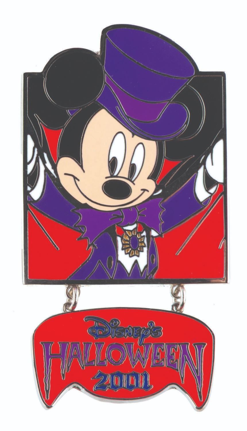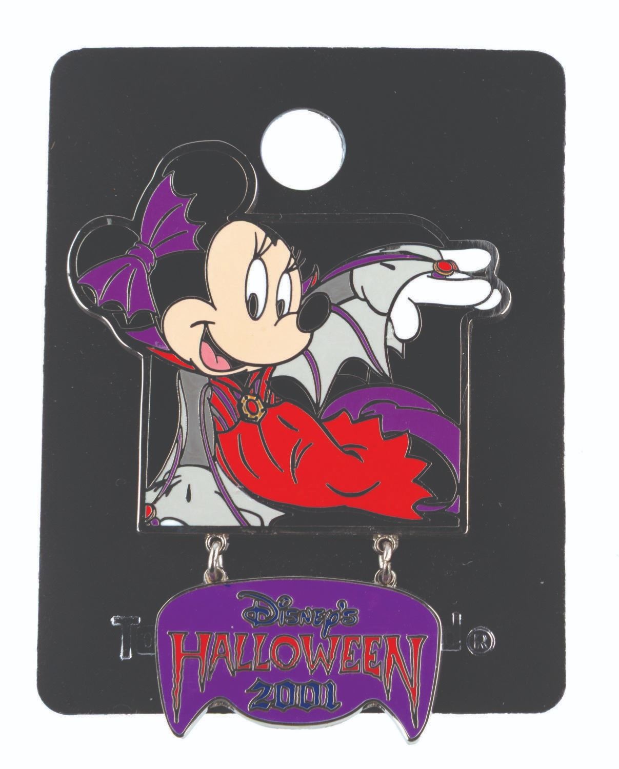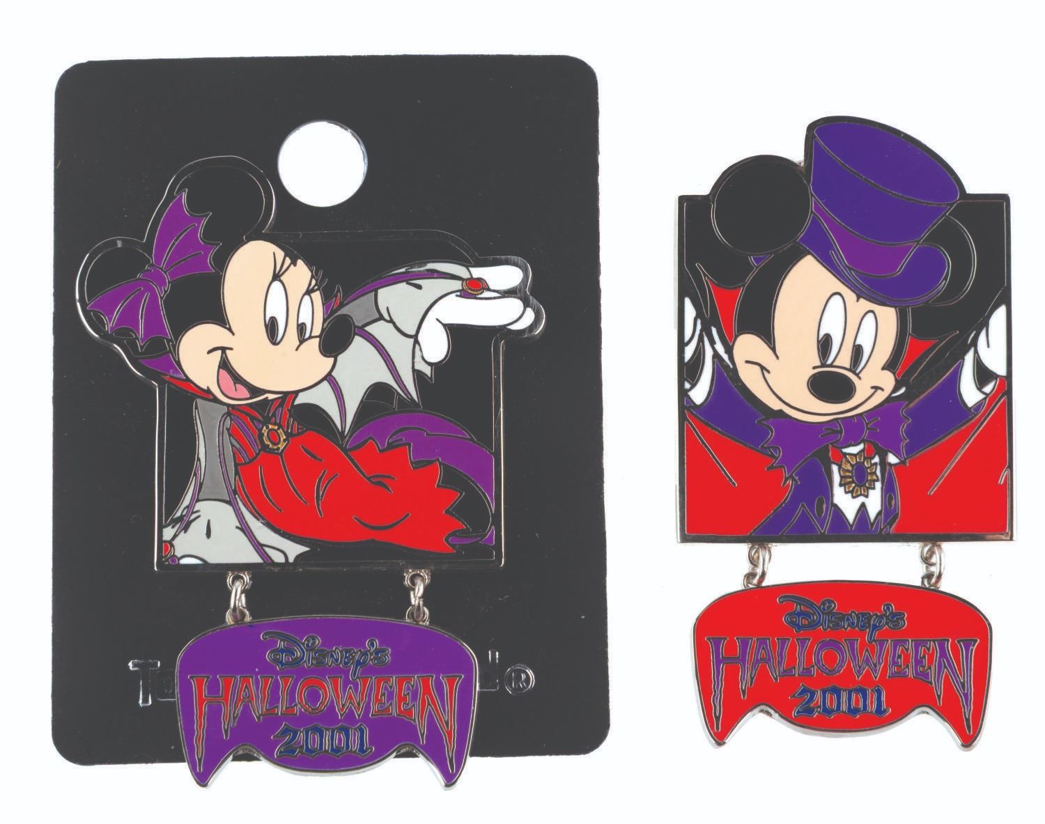 (Tokyo Disneyland, 2001) A pair of vampire Mickey and Minnie Mouse Halloween pins from Tokyo Disneyland. Measuring 2.25" x 1", the pins are in fine condition. The Minnie pin is presented on its original backing card measuring 2.5" x 2", also in fine condition.