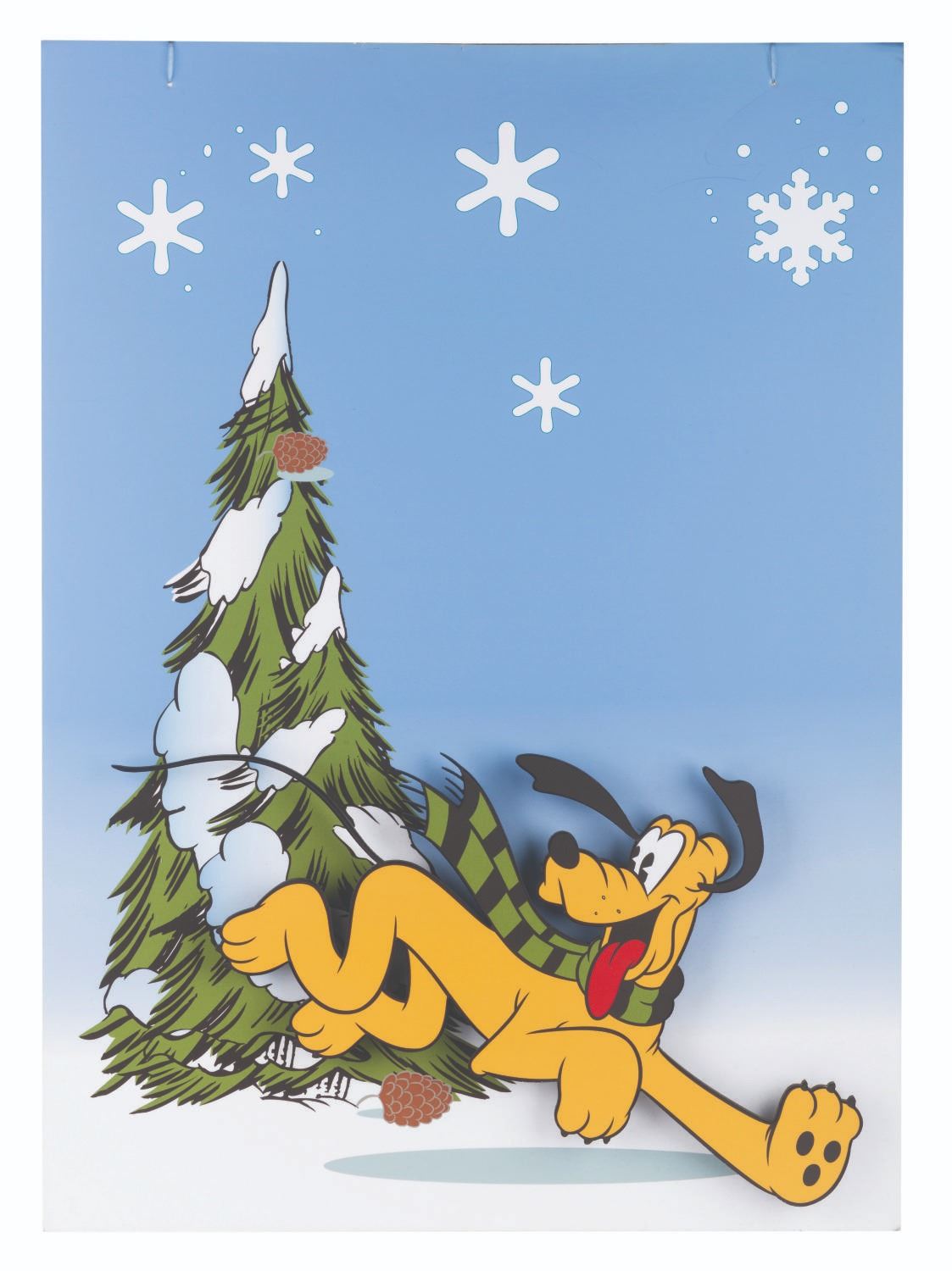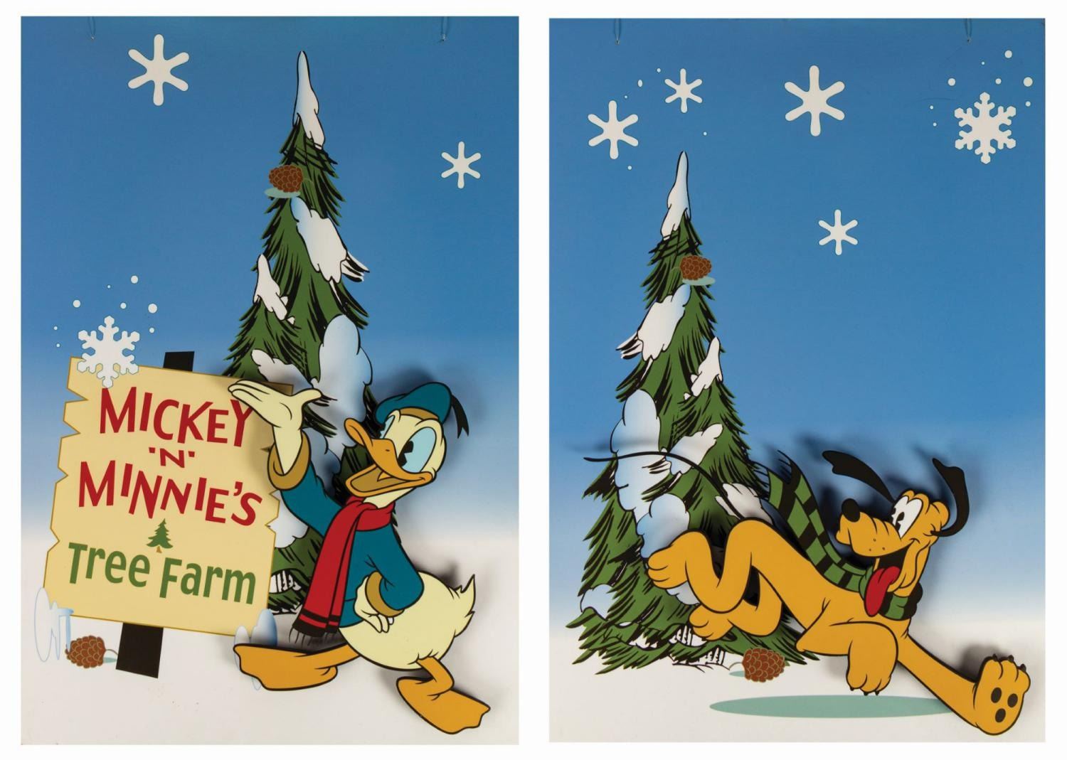 (Disneyland Resort, 2000s) A pair of "Mickey n' Minnie's Tree Farm" dimensional display signs featuring Donald Duck and Pluto. Measuring 20" x 28", the foam core pieces are in very good condition with light wear from Park use.