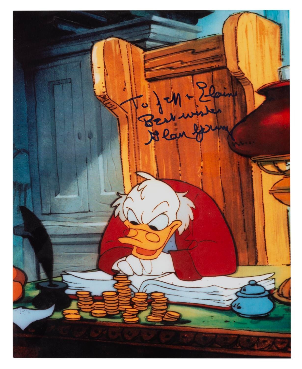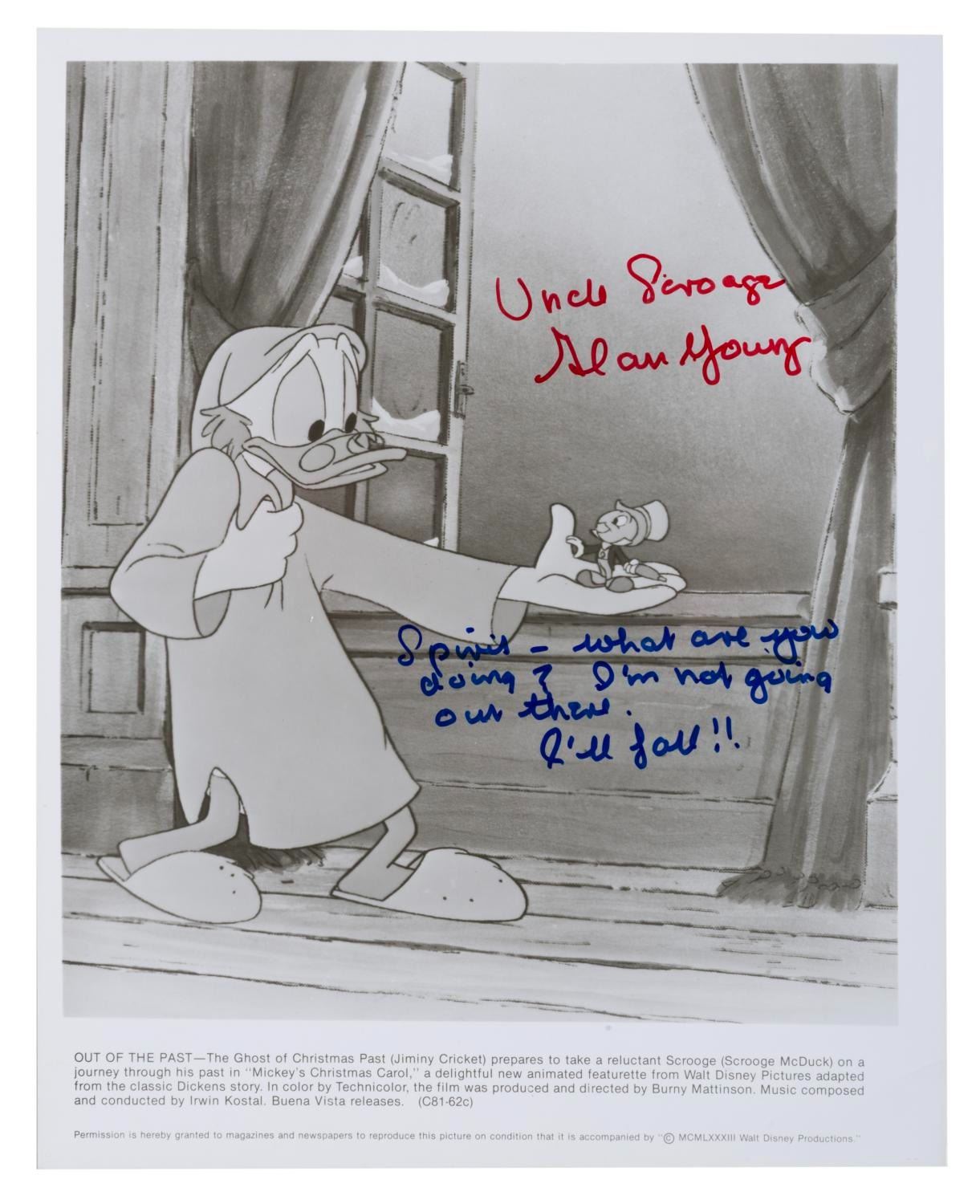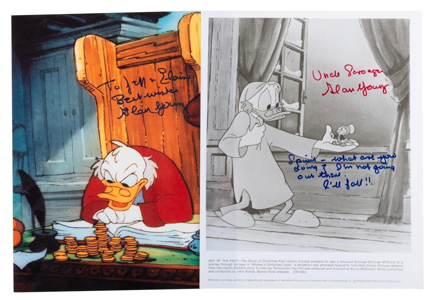 (Disney, 1980s-90s) Two prints of Scrooge McDuck in "Mickey’s Christmas Carol, " signed by voice artist Alan Young. The color print is signed with a dedication, and the black and white signed with a quote from the film. Each measuring 8 " x 10 ", the autographed photos are in fine condition.