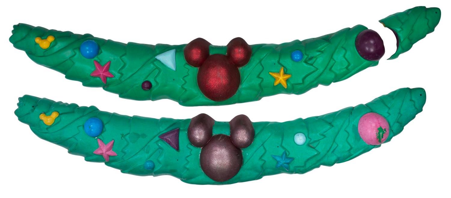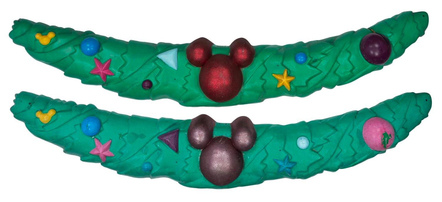 (Disneyland, 2000s-10s) A pair of holiday garland decorations used in specific interior locations of Mickey's ToonTown. Measuring 22"x97"x8", each piece is in good condition exhibiting scuffs, scrapes, and wear from Park display. One decoration is broken, retaining the 16"x6.5"x9.5" separate piece. These large piece may require special shipping arrangements. Please inquire before bidding.