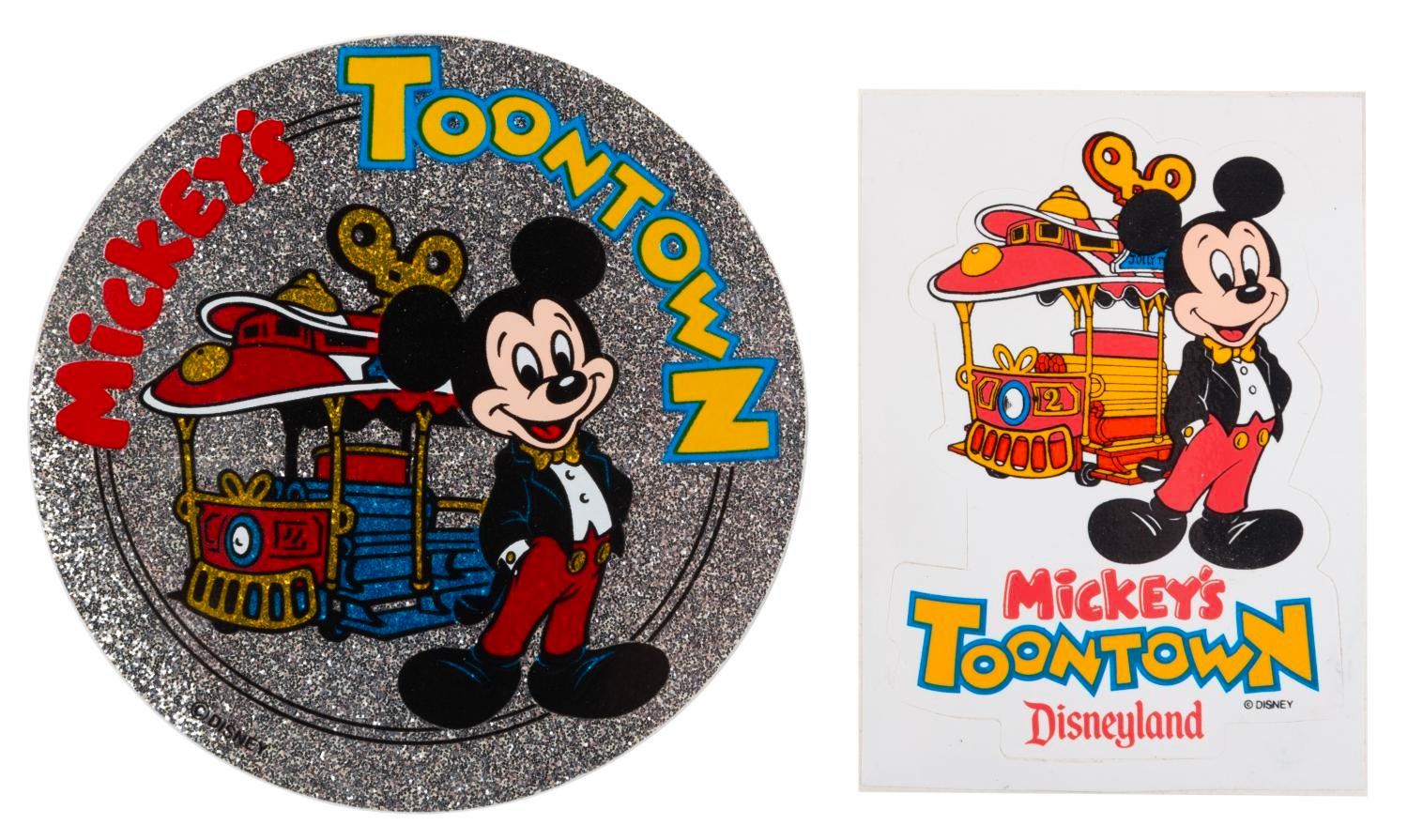 (Disneyland, 1990s) A pair of unused Tontown stickers featuring Mickey and the Jolly Trolley. The 5" diameter silver sticker is in fine condition, and the 3.25" x 4.5" white sticker is in very good condition with light handling wear to the back and edges only.