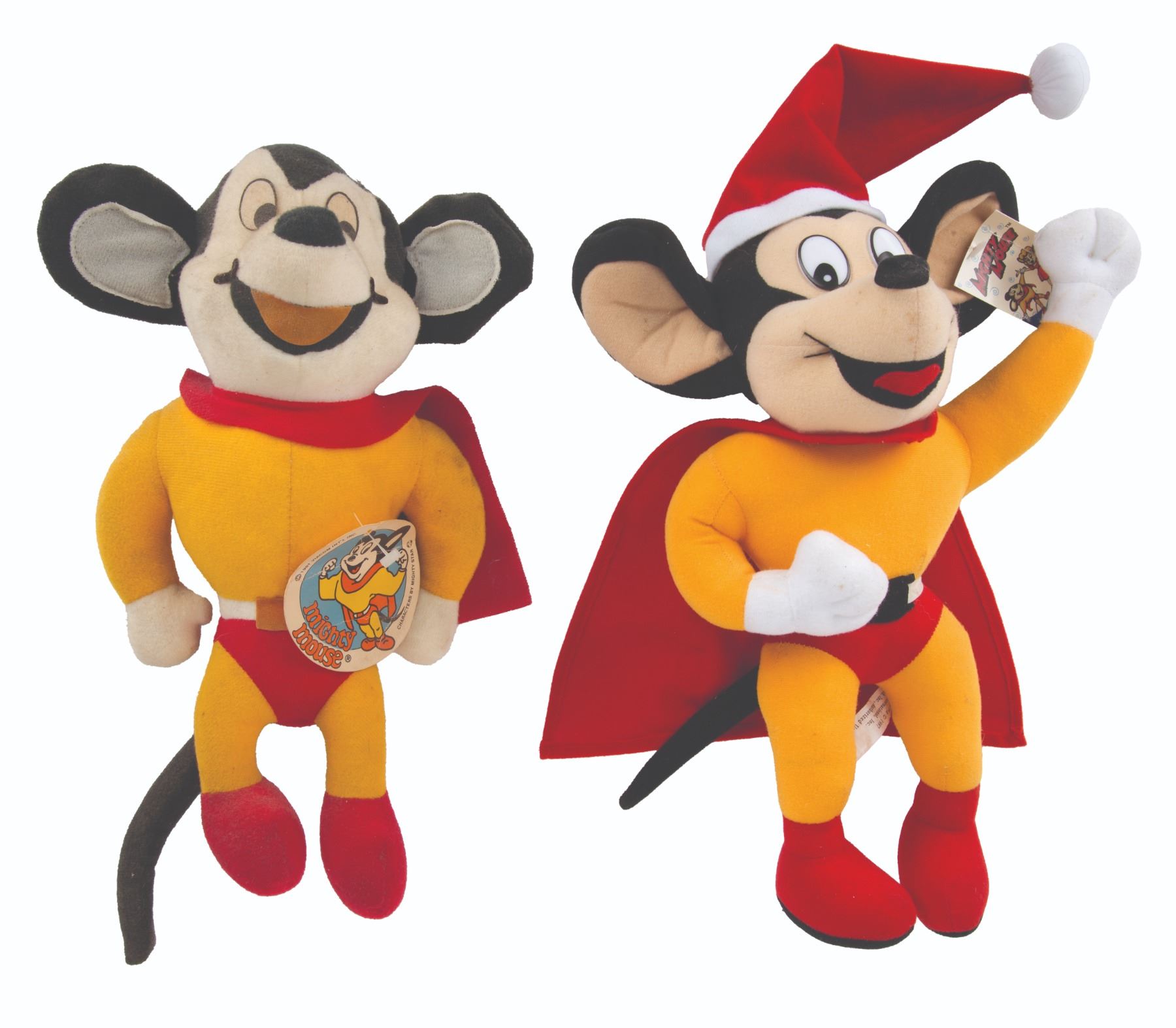(Terrytoons/Viacom, 1981-97) A pair of plush dolls of Mighty Mouse. The 12" Mighty Mouse was produced by Mighty Star in 1981. The 14" doll was produced by AA Plush in 1998. Both have their original tags and display in good condition with spotting, discoloration from age, and the Santa hat partially separated.