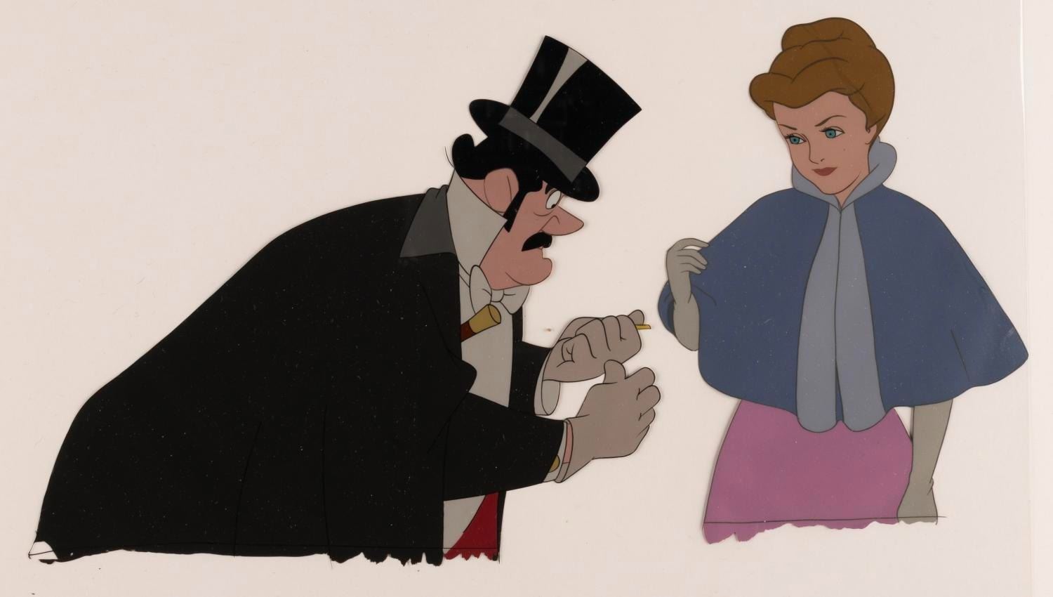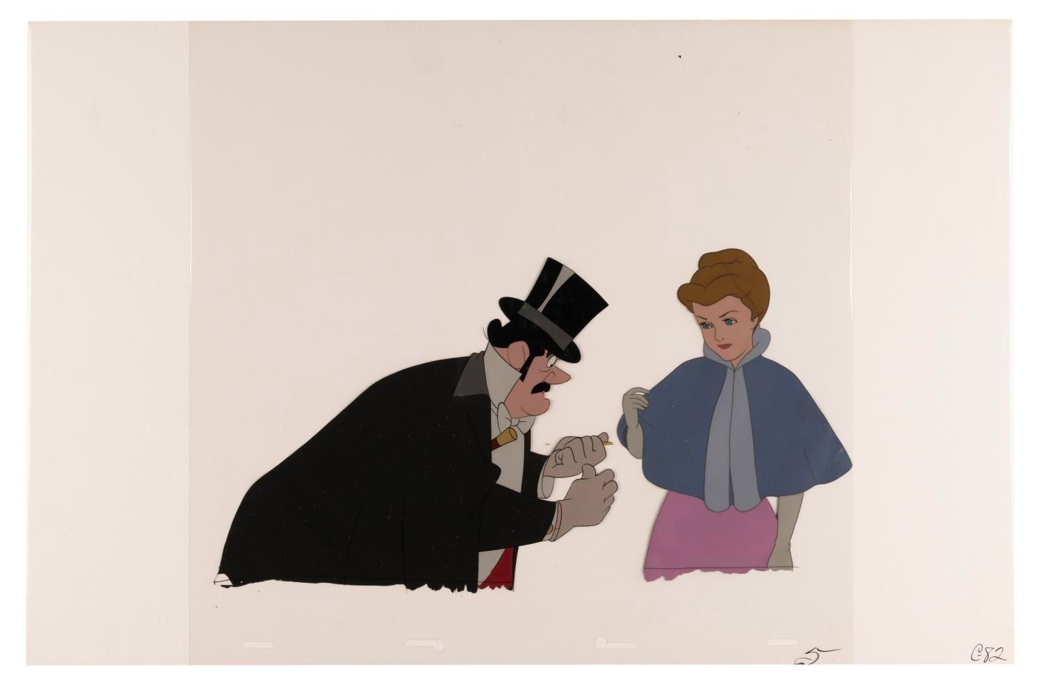 (Disney, 1953) A pair of original production cels of Mr. and Mrs. Darling from “Peter Pan.” Mr. Darling has a character image size measuring 6.5” x 7.75” and Mrs. Darling measuring 4.5” x 6.5”, each on 12.5” x 16” cels. The pair display in very good condition with light paint separation, small scratches, and a .5" spot of paint loss to Mr. Darling's lower edge.
