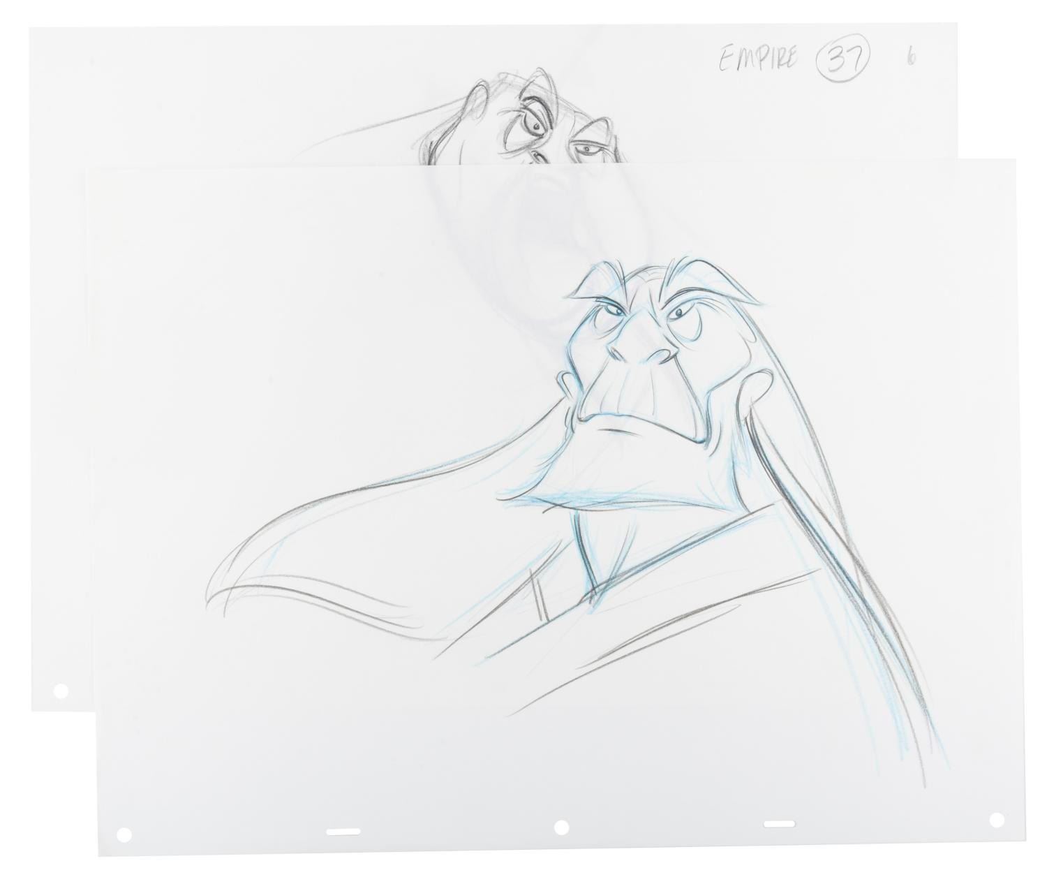(Disney, 1998) A pair of original production drawings of two Fa family ancestors from “Mulan.” The ancestors have image sizes of 8” x 10.5” and 10” x 14” on 12.5” x 17” animation paper. The colored pencil drawings are in very good condition with light creasing.