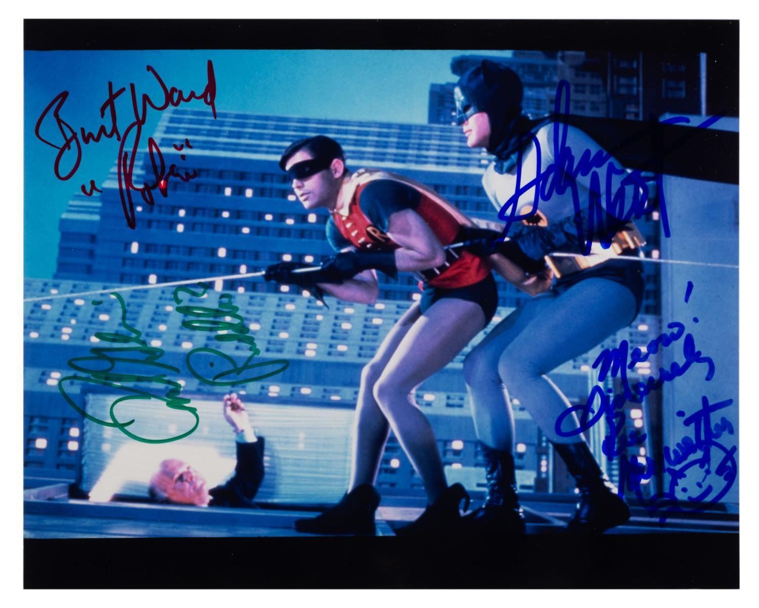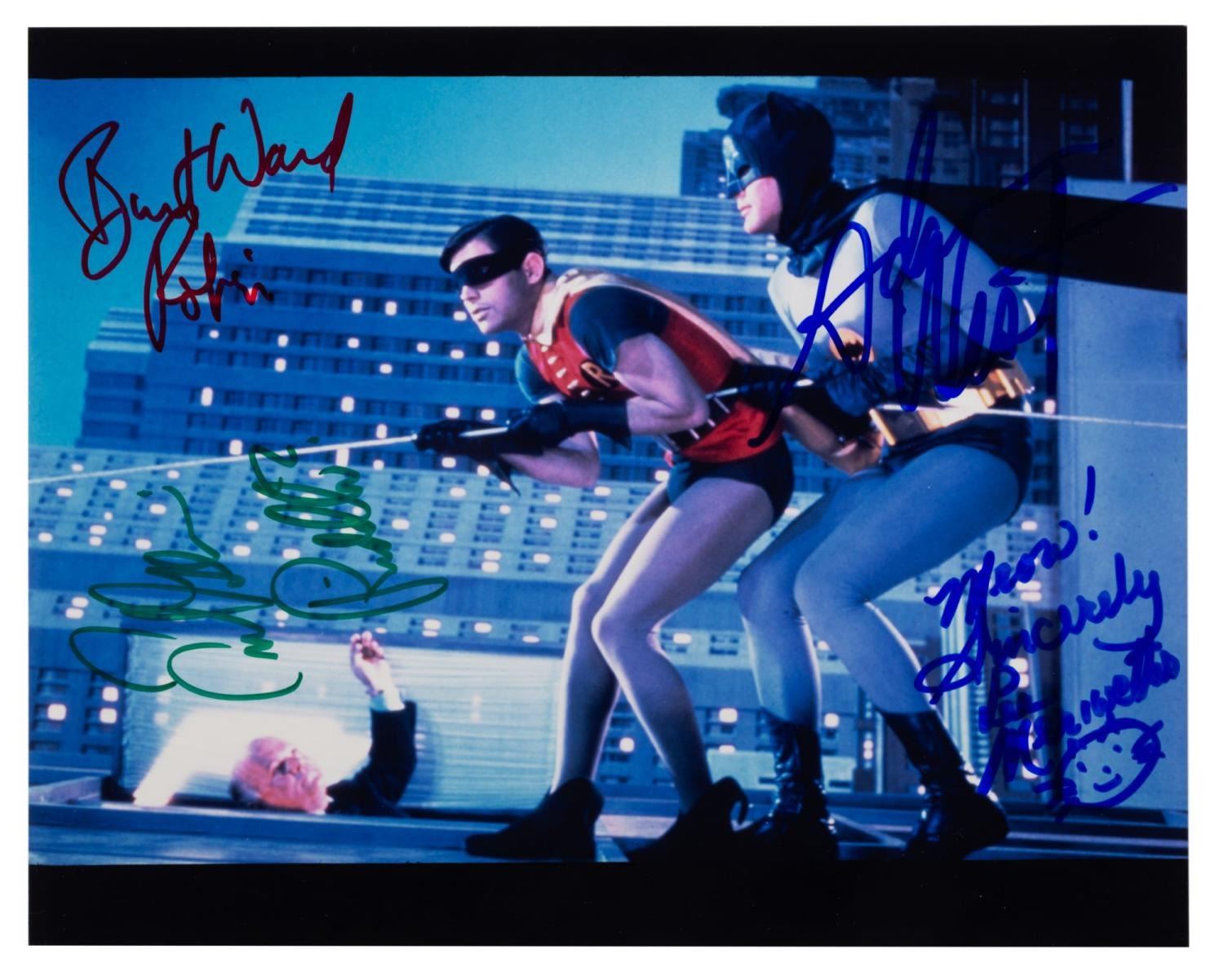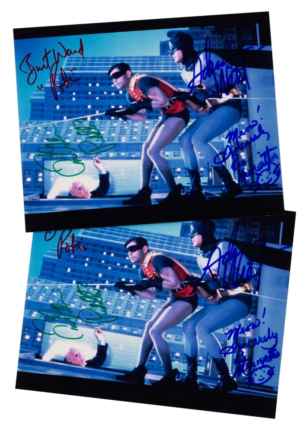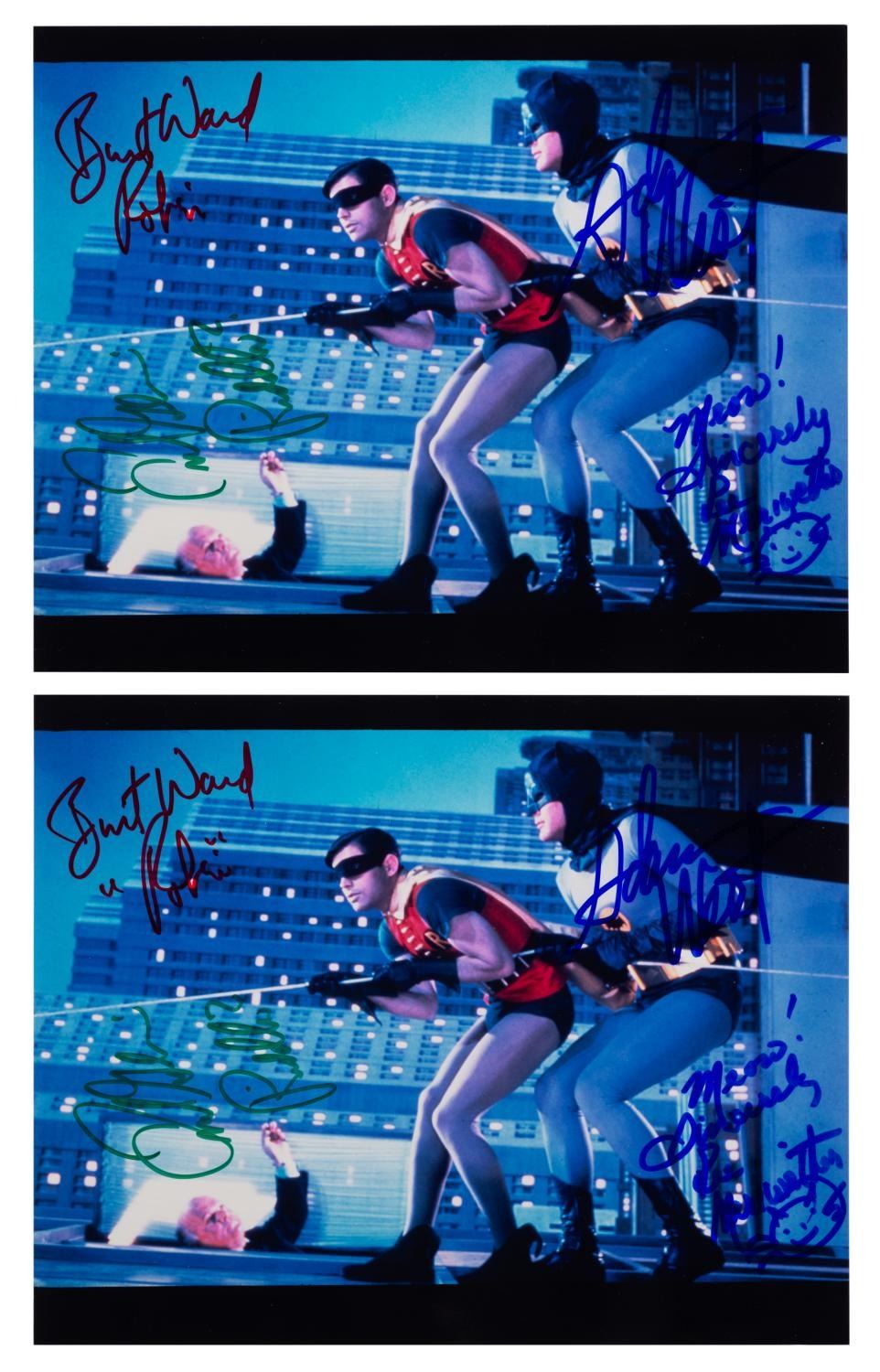 (ABC, 1960s) A pair of publicity photos from the 1966 "Batman" television series, signed by Adam West (Batman), Burt Ward (Robin), Lee Meriwether (Catwoman), and Frank Gorshin (The Riddler). Measuring 8" x 10" each, the photos are in fine condition.
